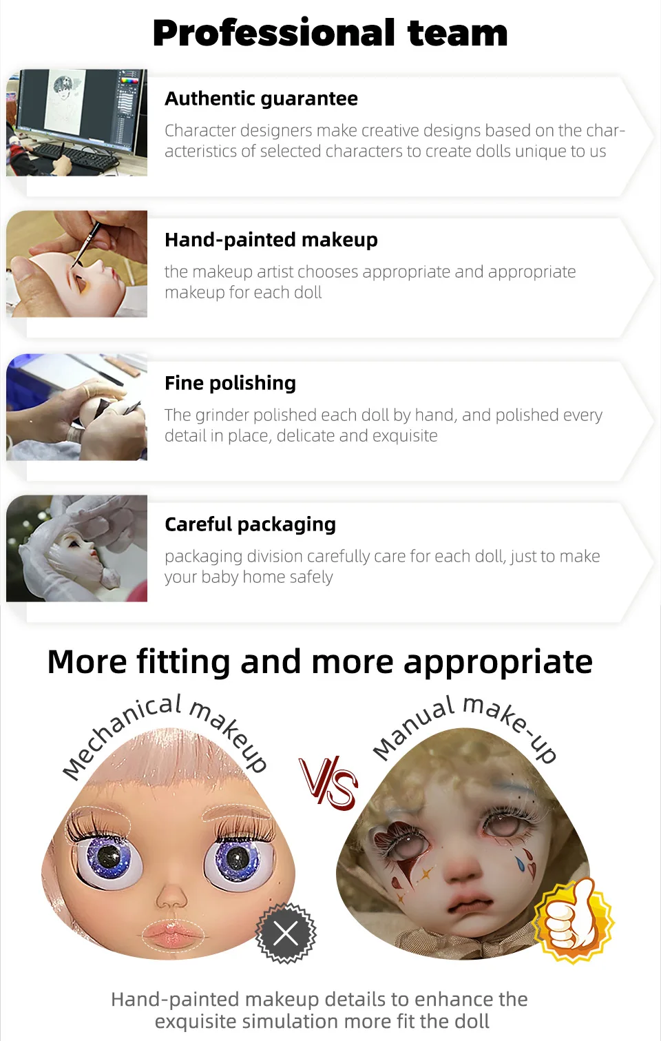 1. Команда силы: более 10 лет занимается куклой BJD, интегрируя исследования и разработки, дизайн, производство и продажи; Владеет оригинальным старшим художником, моделерами, комодом, визажистом, от создания, дизайна до формования, лепки, шлифовки, макияжа, А затем к дизайну одежды и производству до сотен рабочих процедур, таких как шитье, моделирование, выполненное опытными мастерами, представленный вашей кукле BJD каждый стиль уникален и имеет высокую эстетическую ценность искусства.