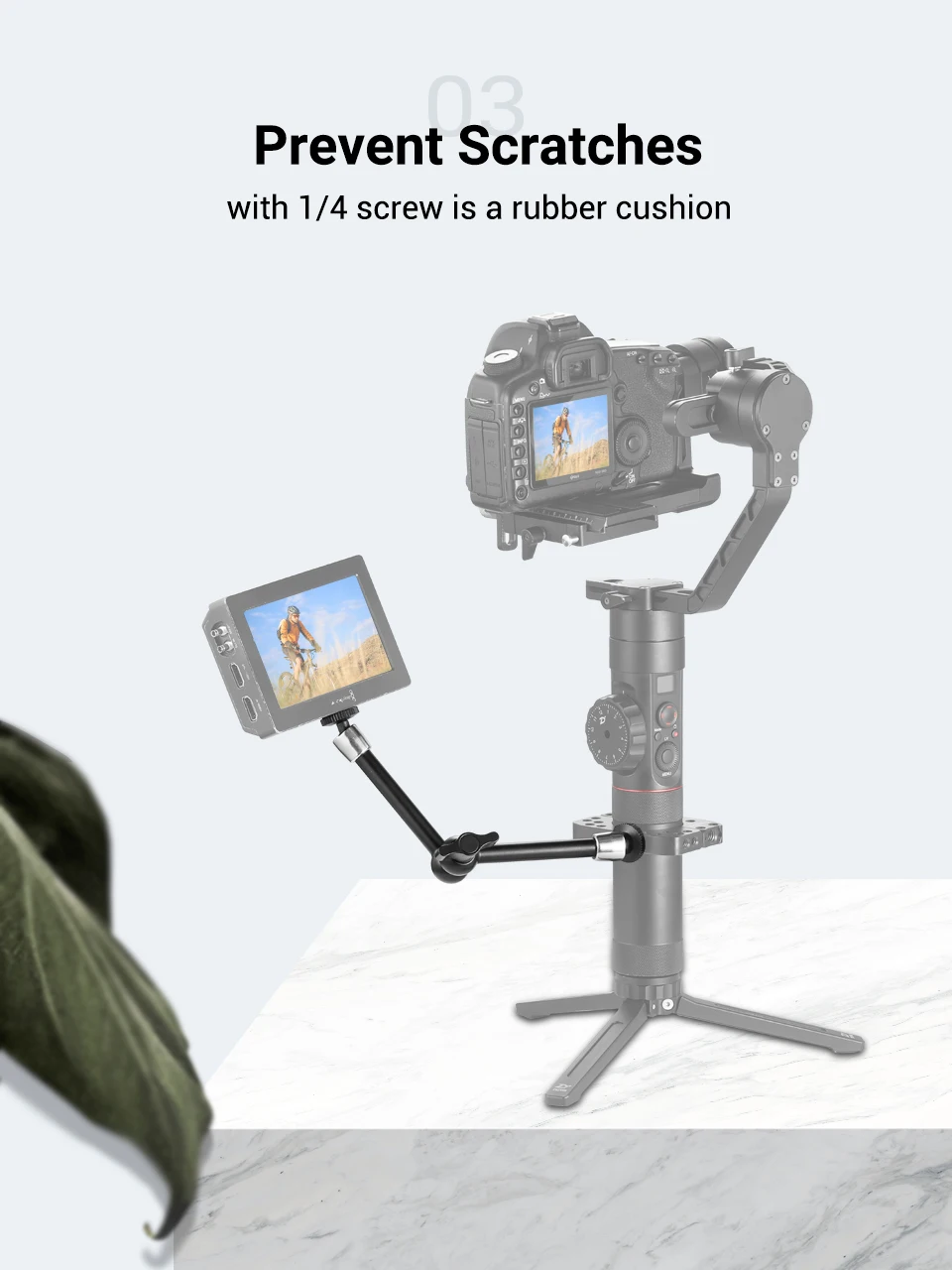 Он оснащен винтами 1/4 "на обоих концах соответственно. Таким образом, он может прикрепить монитор с помощью винта 1/4 "на одном конце и прикрепить аксессуары с резьбовыми отверстиями 1/4"-20 на другом конце, например NATO Rail 1973, 15 мм штанга 1182 и быстроразъемный зажим для штанги, 1976. Крепление с винтом 1/4 "-это резиновая подушка, которая защищает мониторы от царапин и помогает блокировать монитор плотнее. Он оснащен эргономичной гайкой для большего удобства, что может помочь настроить любые углы на основе ваших потребностей.