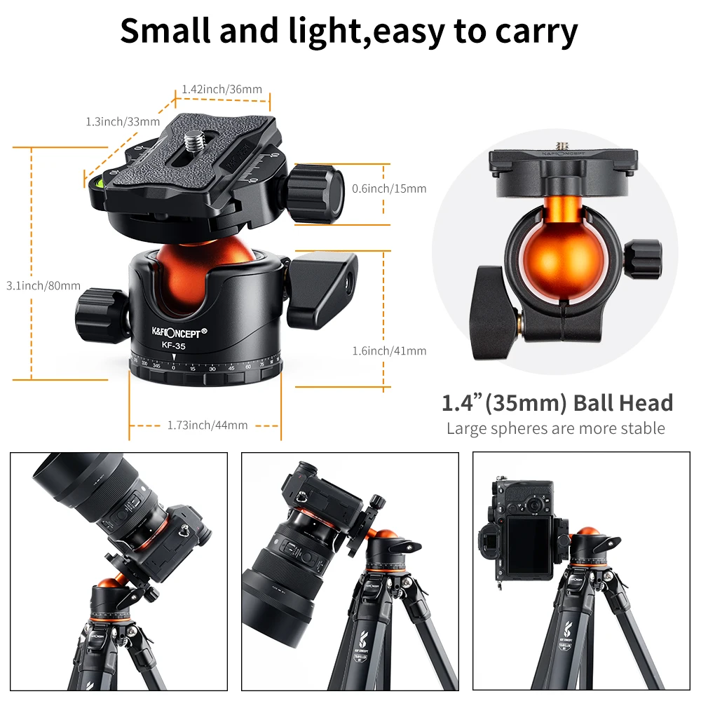 【Металлическая шаровая Головка штатива 】 Изготовлен из алюминиевого сплава, прочный и прочный; принимает обработку с ЧПУ и обработку анодирования поверхности, изысканное качество изготовления и плавную работу.