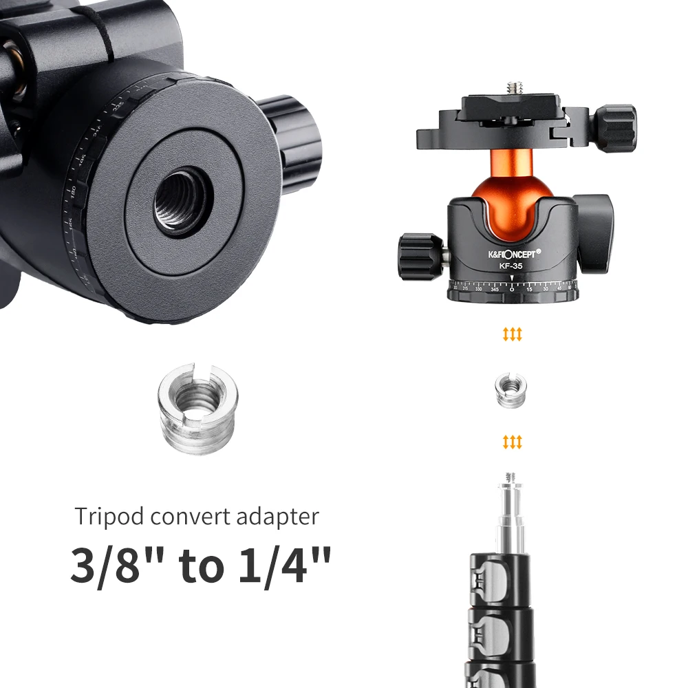 【Широкая совместимость】 С нижним отверстием для винта 3/8 дюйма и трансформируемым винтом от 1/4 до 3/8 дюйма шаровая Головка может быть установлена практически на любой штатив, монопод и другой кронштейн для фотографии с винтом 1/4 дюйма или 3/8 дюйма.
