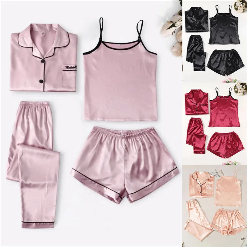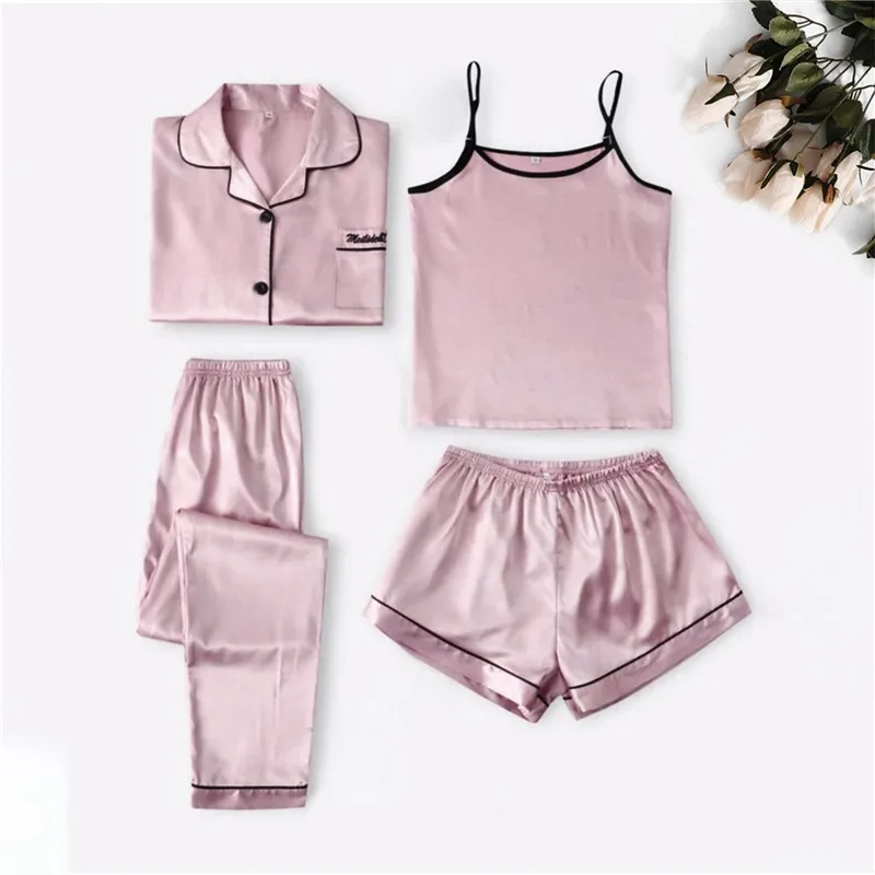 Шелковая пижама для женщин, домашний костюм, однотонная Пижама, комплект из 4 предметов, атласная ночная рубашка, одежда для сна, 2023, Пижама для женщин