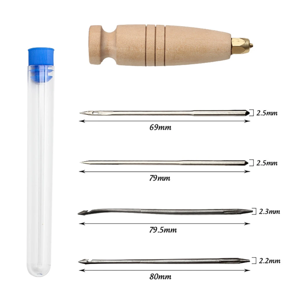 Two Sets: There are two awl needle tool sets. The handles are made of lotus wood or beech wood. The handle awl interface is made of brass, which can accommodate a awl needle inserted into the handle with a diameter of 1.8-2.5mm.