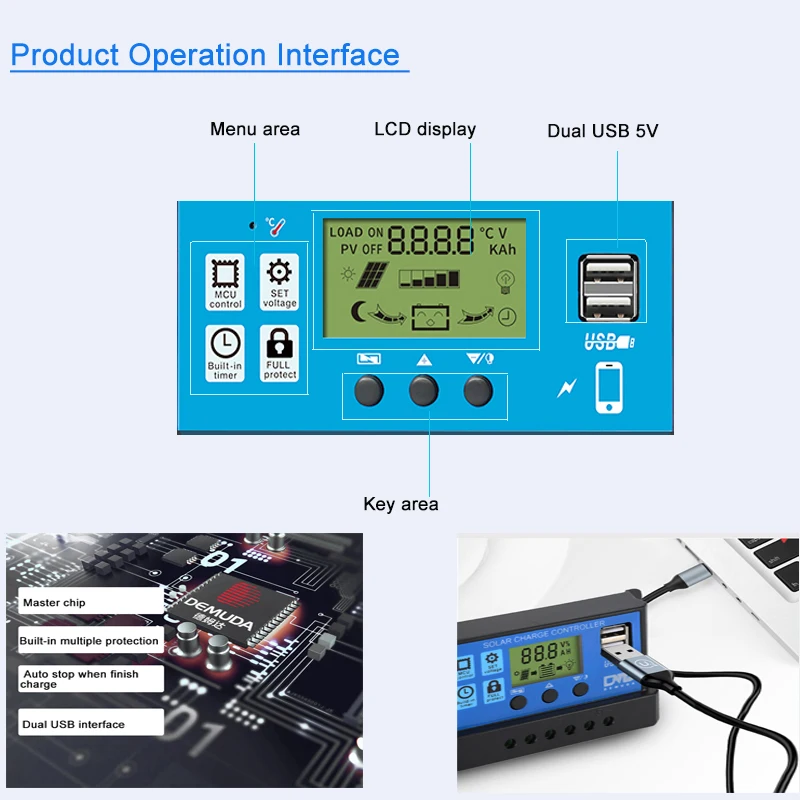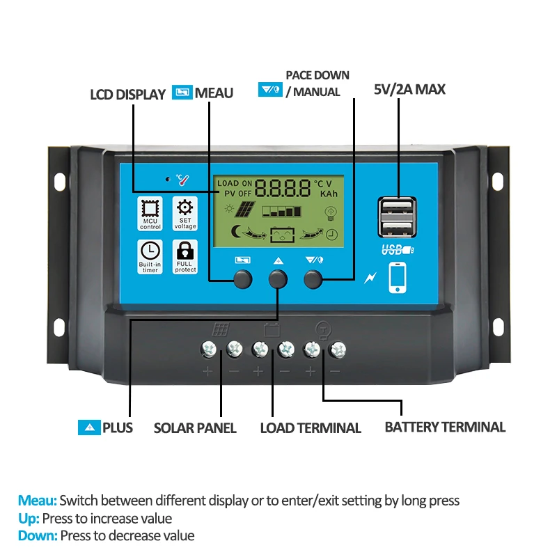Это очень практичный Солнечный контроллер ШИМ, он маленький и легкий, вы можете использовать свинцово-кислотные, гелевые, герметичные, Затопленные, AGM батареи 12 В и 24 В. Он может полностью удовлетворить требования вашей домашней фотоэлектрической системы (включая систему домашнего освещения).