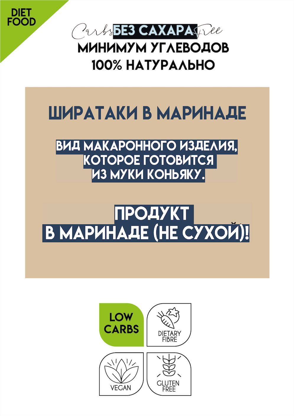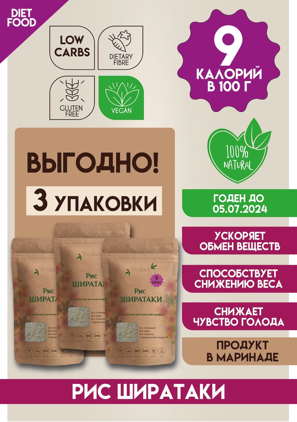 Описание: Рис ширатаки - это Ширатаки из коньяку в виде риса. Напоминает по текстуре стеклянную лапшу фунчезу или грибы. Нейтрален по вкусу, принимает вкус соусов и заправок (мясо, овощи), с которыми приготовлен. Существенно снижает калорийность блюд, способствует улучшению пищеварения. Состав: вода очищенная, мука из коньяку, кальция гидроксид. Вес без маринада около 200 г, с маринадом - 340 г. Пищевая ценность для 100 г продукта: белки - 0,0 г жиры - 0,0 г углеводы - 0,6 г натрий - 0,3 г диетическая клетчатка - 3,56 г. Энергетическая ценность продукта - 9 кКалл.