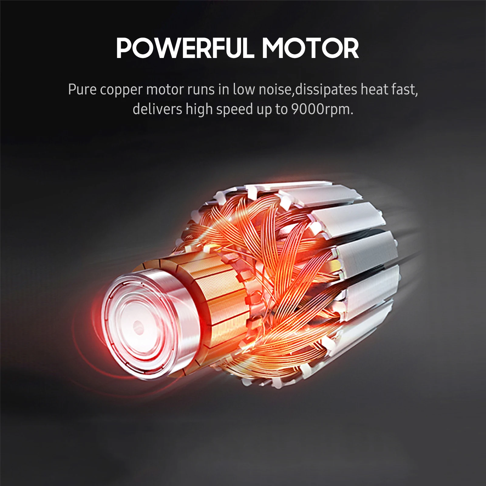 Мощный Мотор:Двигатель из чистой меди с прочной защитной пылезащитной крышкой работает с низким уровнем шума, быстро рассеивает тепло, обеспечивает высокую скорость до 9000 об/мин.