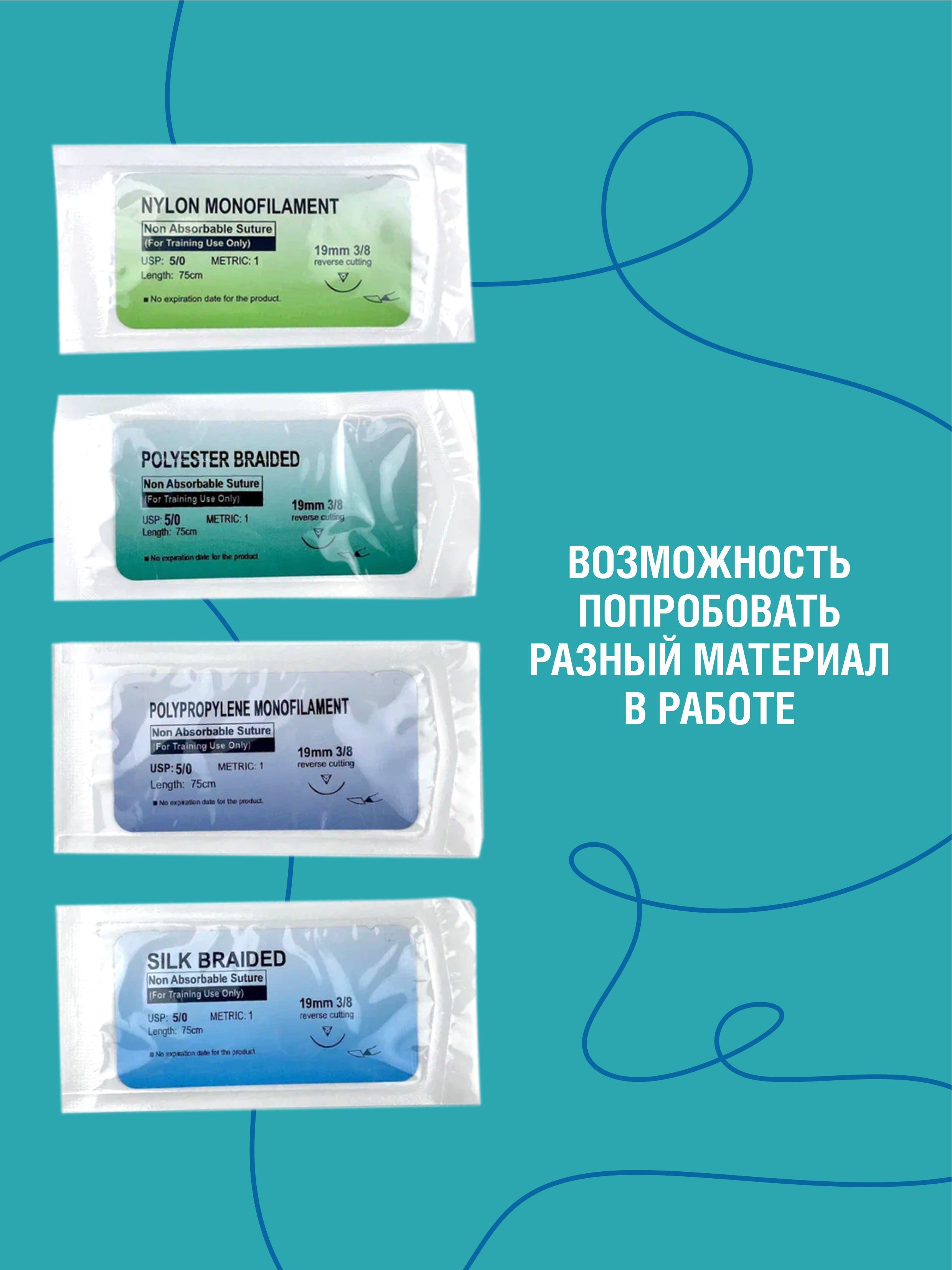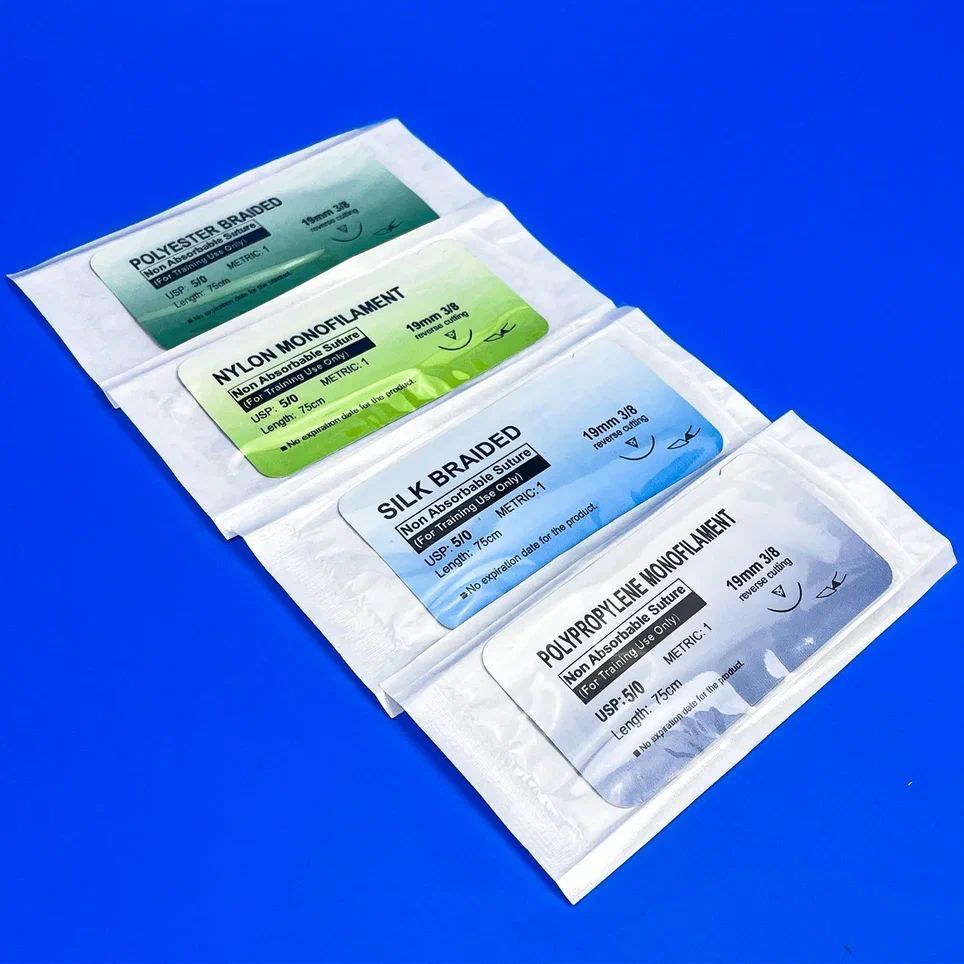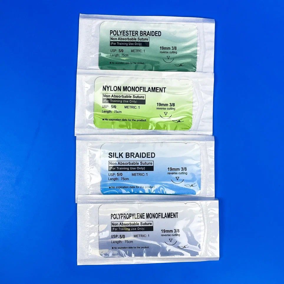 Описание: Неабсорбируемые монофиламентные шовные материалы, пластичны и устойчивы к разрыву. Применяются во всех областях оперативной хирургии, в т.ч. для сшивания мягких тканей и в нейрохирургии, офтальмологии и сердечно-сосудистых операциях. Характеристики: • Прочная игла (19 мм, изгиб 3/8) • Мягкая и гибкая нить (75 см.) • Беспрепятственное прохождение через ткани • Высокая прочность на разрыв • Надежная вязка узлов Комплектация: 1. Нейлон 5.0 -1 шт. 2. Полиэстер 5.0 -1 шт. 3. Полипропилен 5.0 -1 шт. 4. Шёлк 5.0 -1 шт Набор нитей разных видов и размеров позволят Вам расширять границы хирургических навыков. Атравматический шовный материал предназначен только в учебных целях. Совершенствуйтесь вместе со Scalpel med!