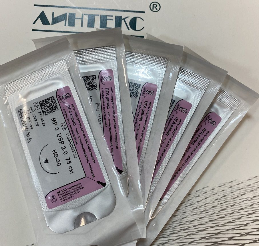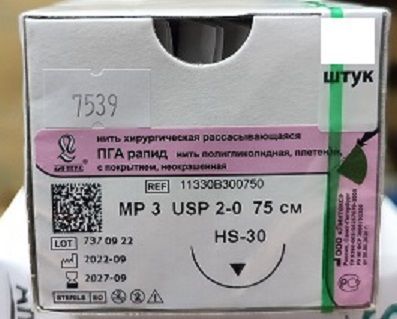 Шовный материал хирургический ПГА-рапид USP 2/0 (МР 3), 75см., с иглой РЕЖУЩАЯ HS-30, неокр. (5шт/уп) Линтекс