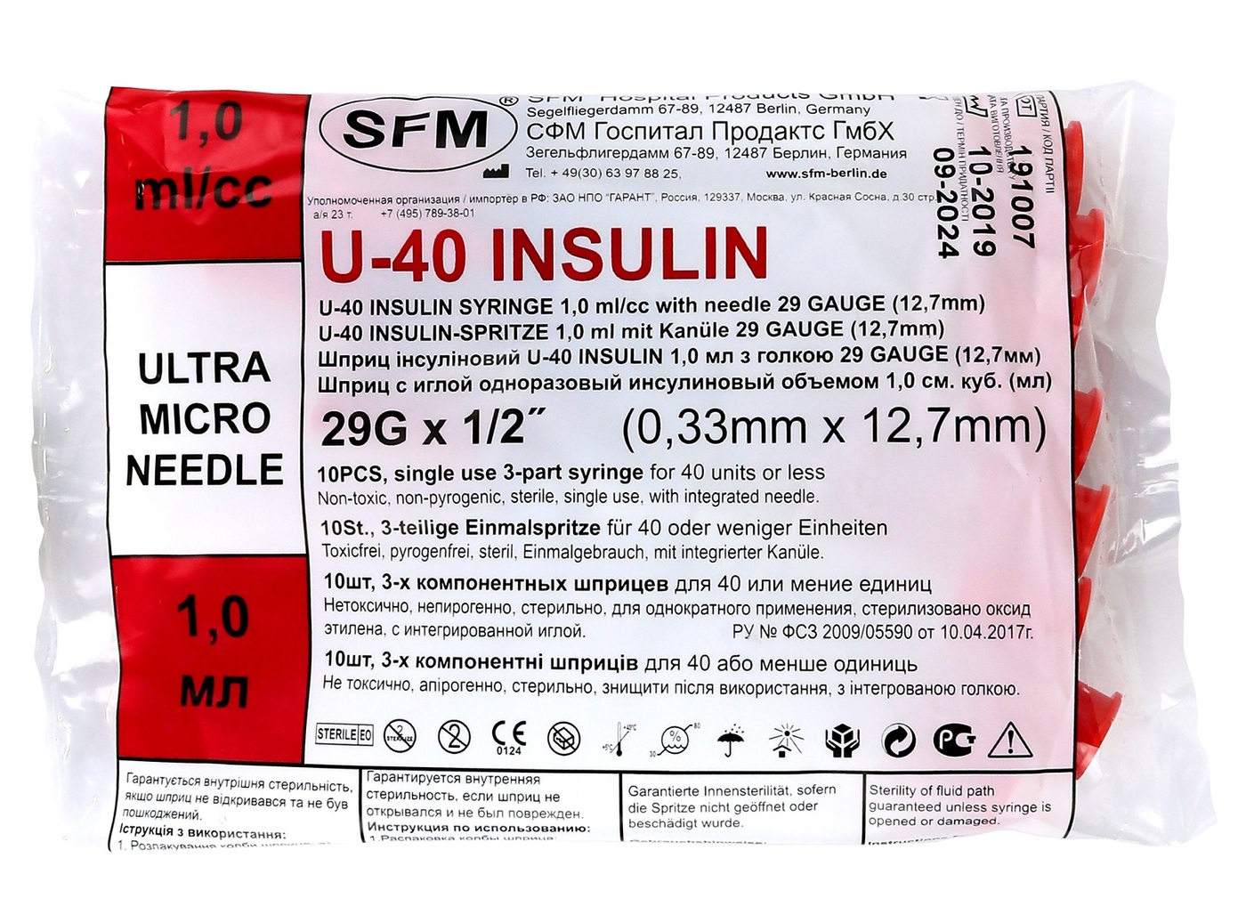 Шприц 1,0 мл. U-40 игла интегрированная 0,33х12,7 мм - 29G, 10 штук10 шт.