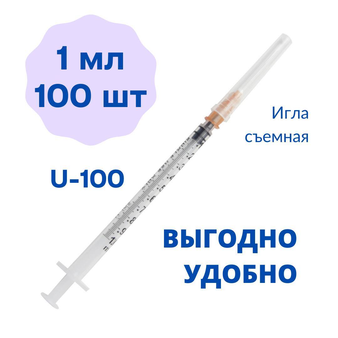 Шприц 1 мл инсулиновый U-100 комплект 100 шт 3-х компонентный, съемная игла 0,45х13 мм - 26Gх1/2, шприц для инъекций одноразовый стерильный 1 мл U100 упаковка 100 шт, шприц медицинский трехкомпонентный 1мл для уколов надетая игла 26G