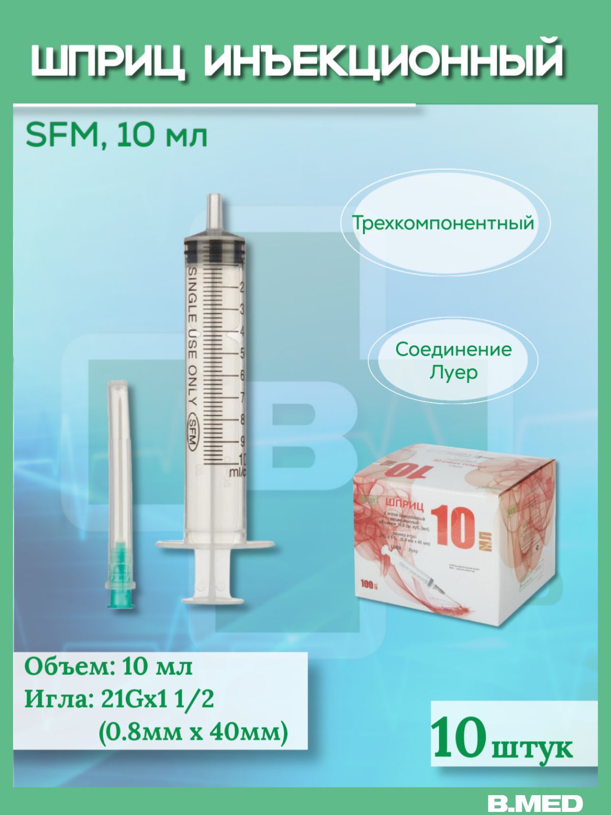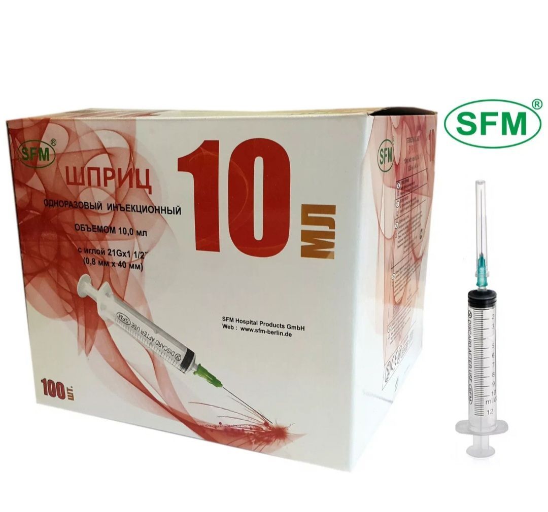 Шприц 10 мл, SFM,с иглой 21Gх1 1/2 (0,8ммх40мм) Luer Луер, 10 шт