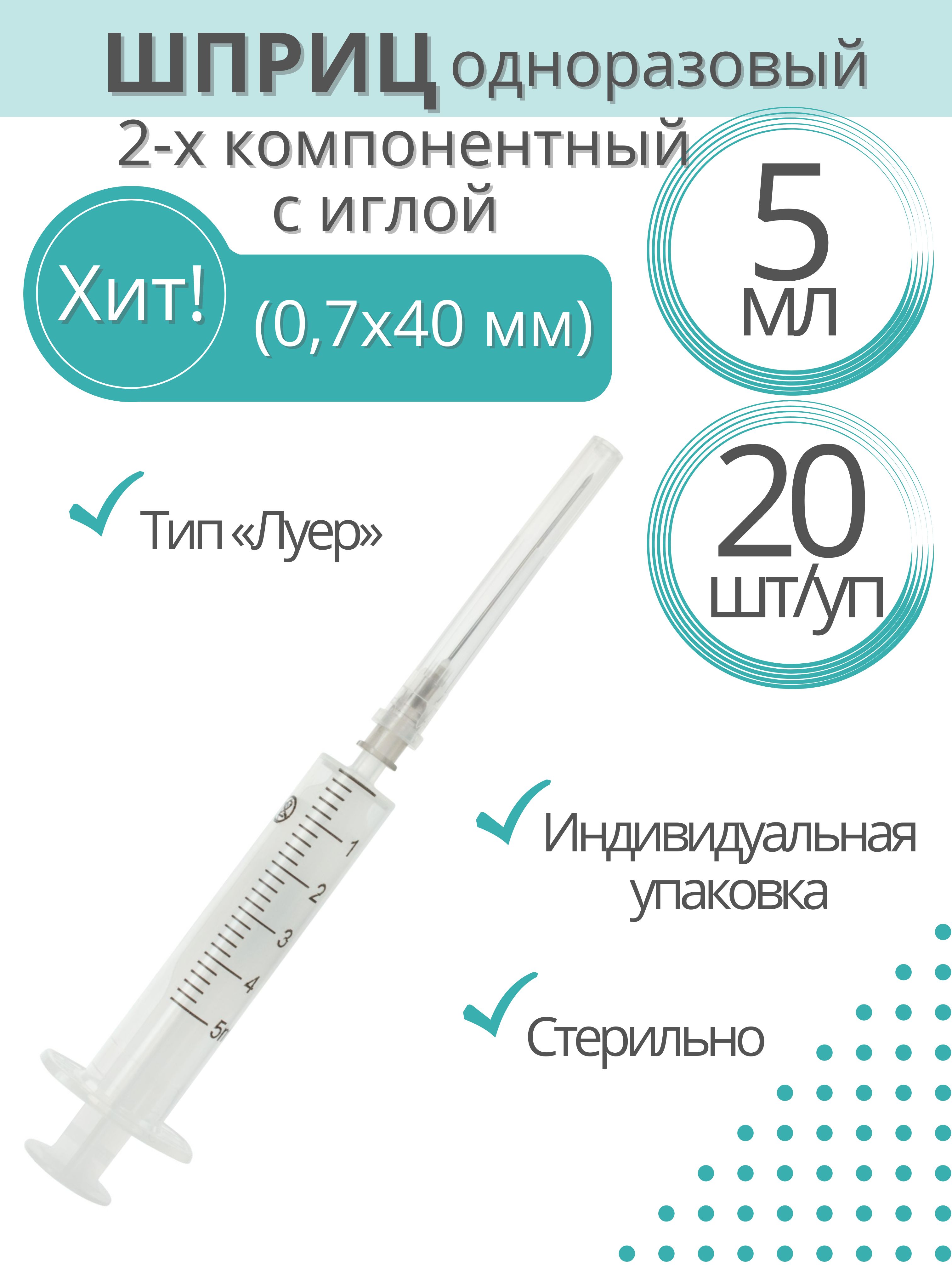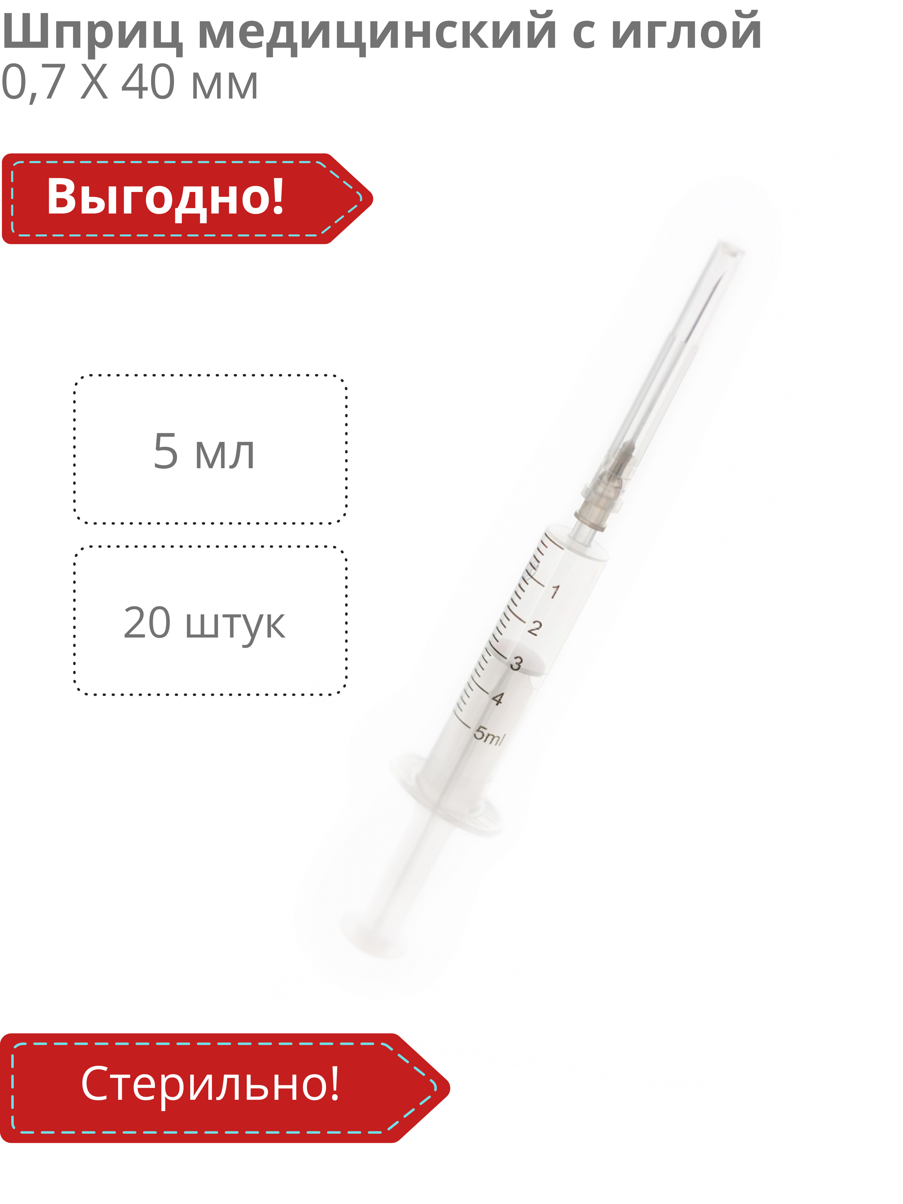 Объем 5 мл, размер иглы 0,7х40 мм.