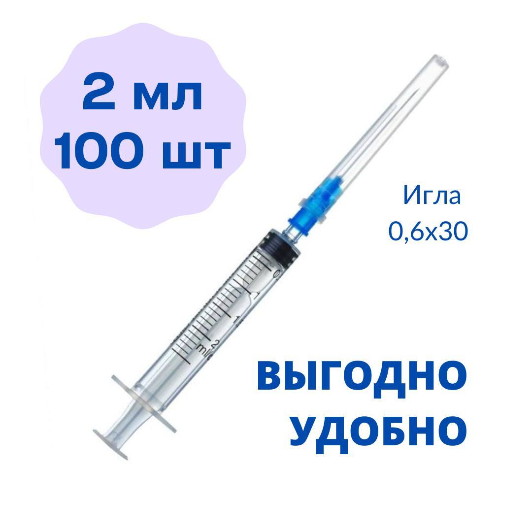 Шприц 2 мл комплект 100 шт в пакете, стерильный 3-х компонентный, игла 0,6х30 - 23G PASCAL / шприц для инъекций одноразовый 2 мл упаковка 100 шт / шприц медицинский объем 2мл для уколов трехдетальный с надетой иглой 23G x 1 1/4 луер