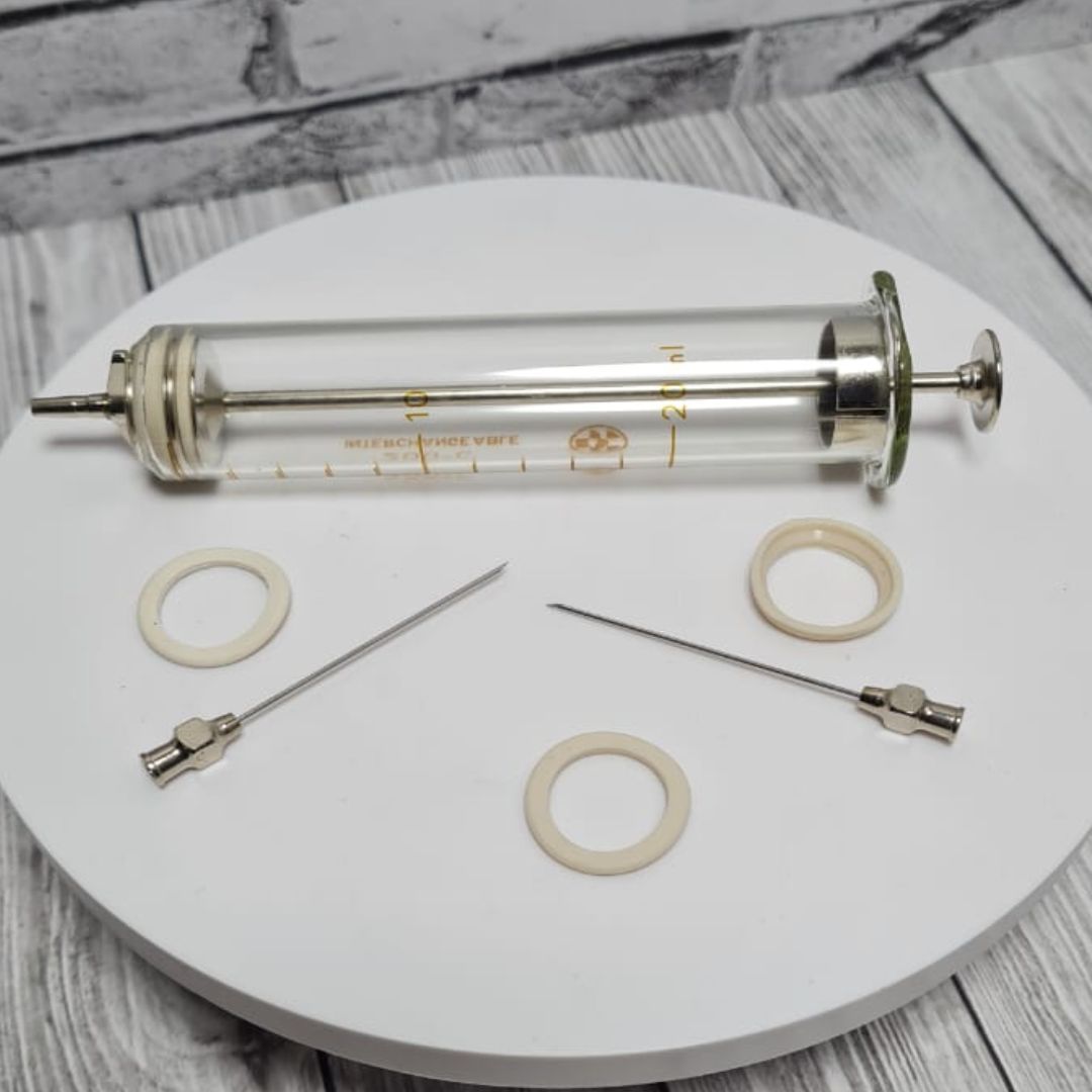 Шприц 20 мл стеклянный многоразовый. В комплекте многоразовые иглы.