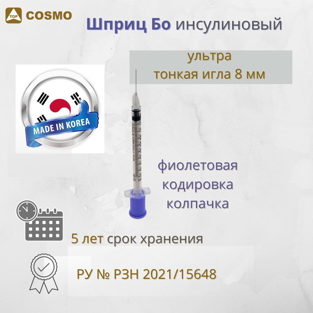 • Шприц БО инсулиновый 1мл с интегрированной иглой 31G (0,26х 8мм),U100(50 делений)100шт-инсулиновый, для ботулинотерапии