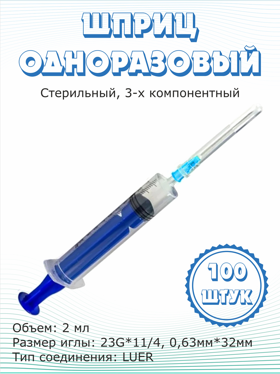 Шприц инъекционный 2 ml , игла 0,63х32мм (23Gх1 1/4), 100 штук.