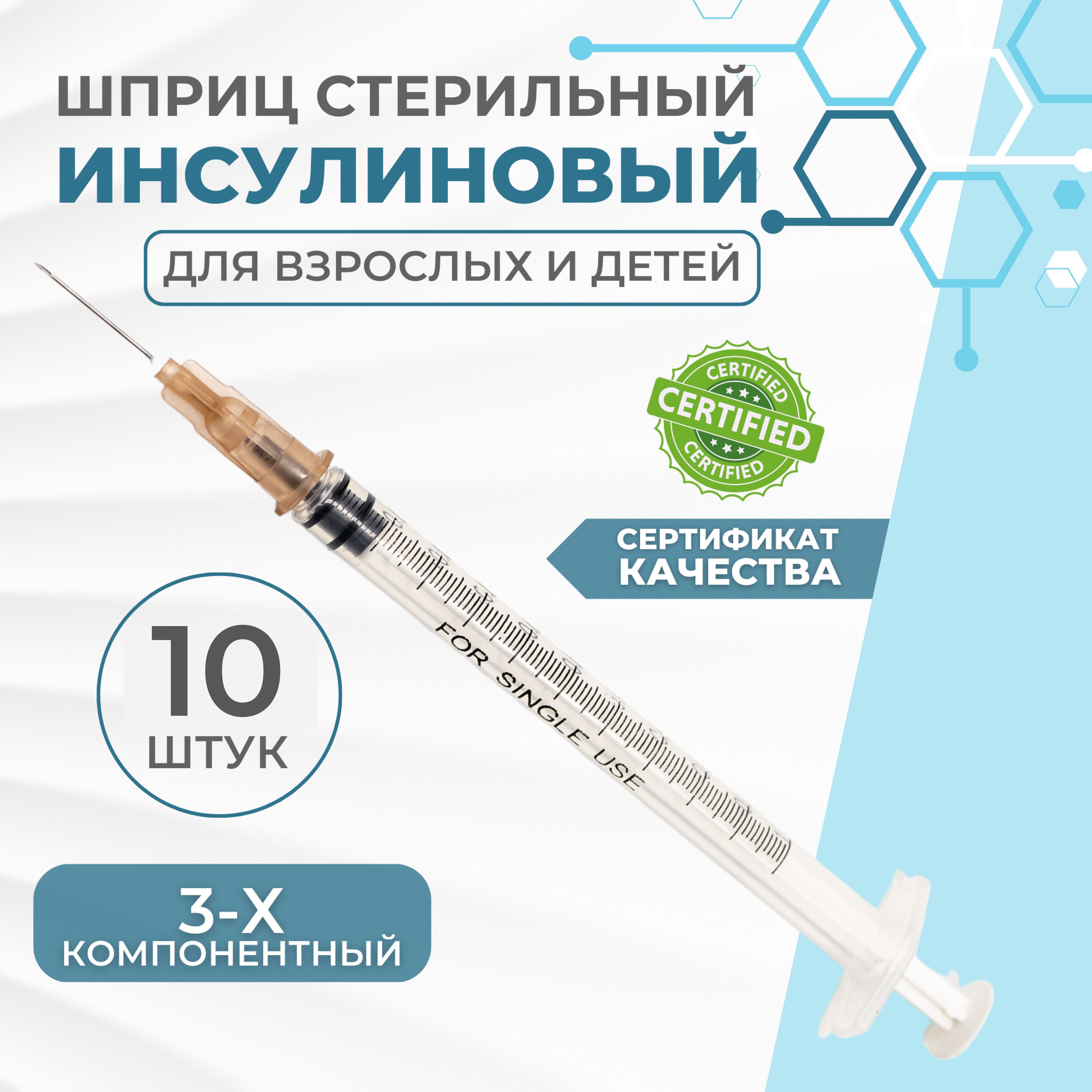 Шприц инсулиновый 1 мл., 10 штук, 3-х компонентный
