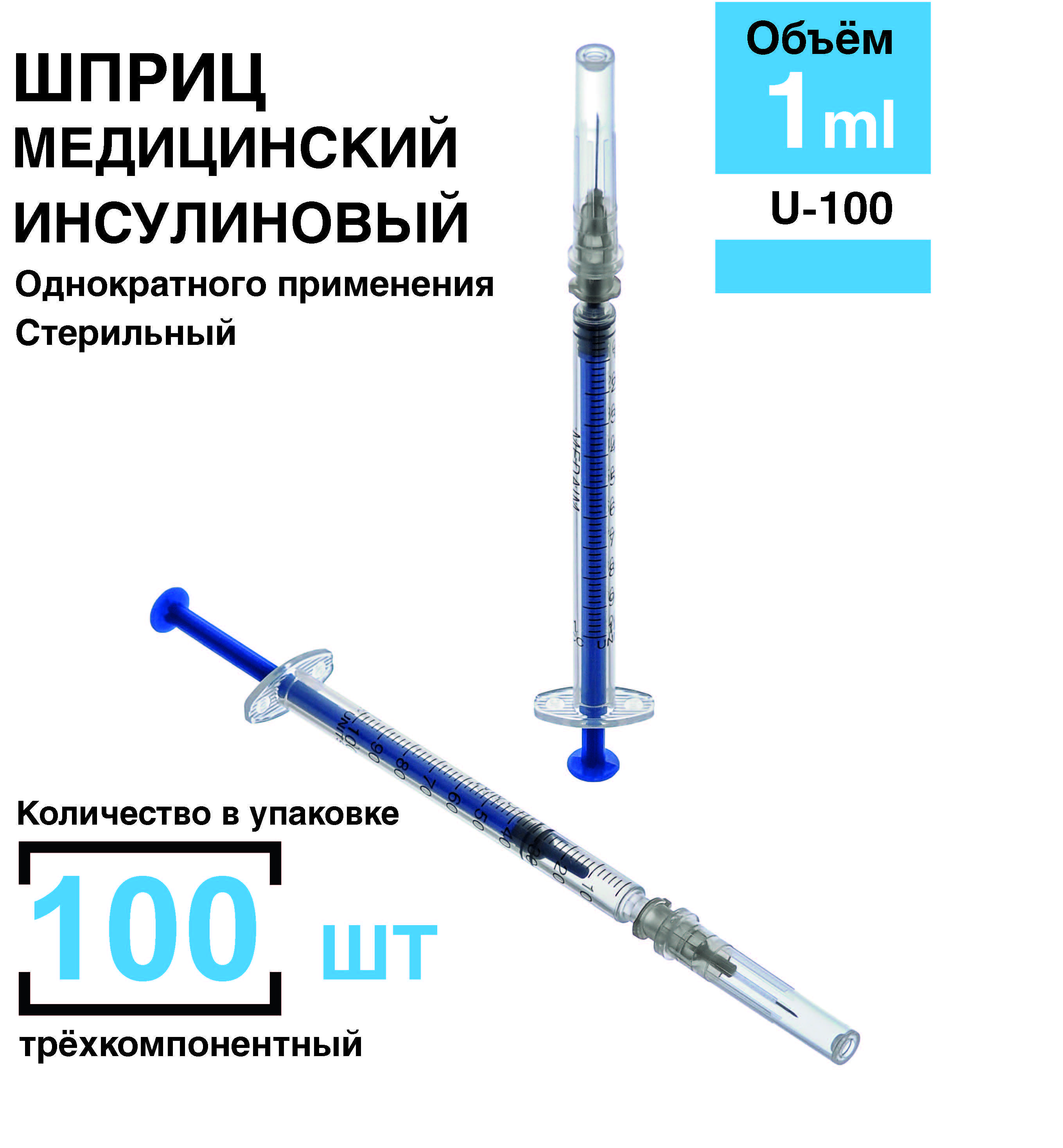 Шприц инсулиновый 1 мл U-100 размер 26G (игла 0,45 х 12 мм) 100 шт