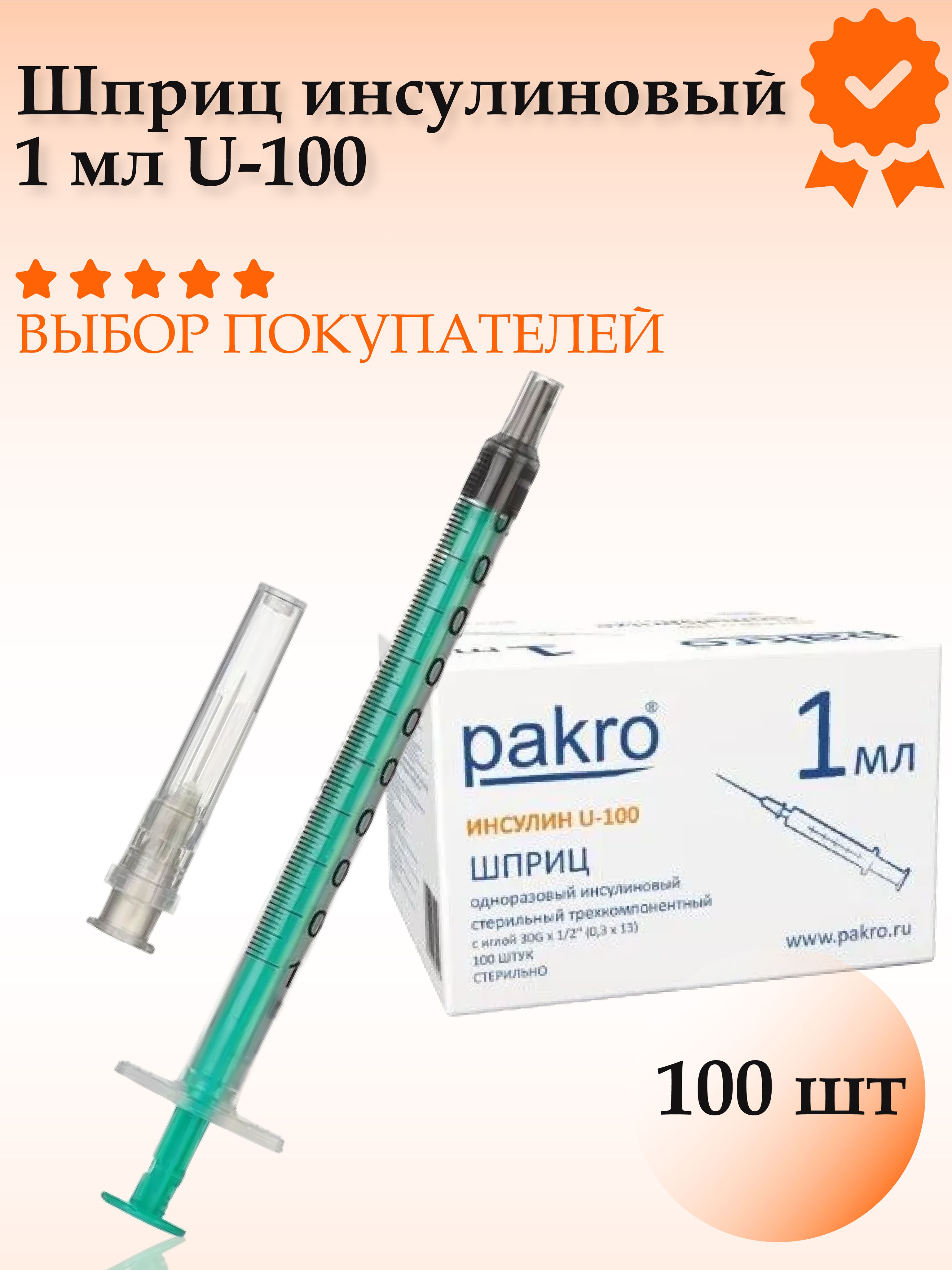 Шприц инсулиновый 1мл U-100 c иглой 30G 0,30 х 13 мм (100 шт.), Pakro