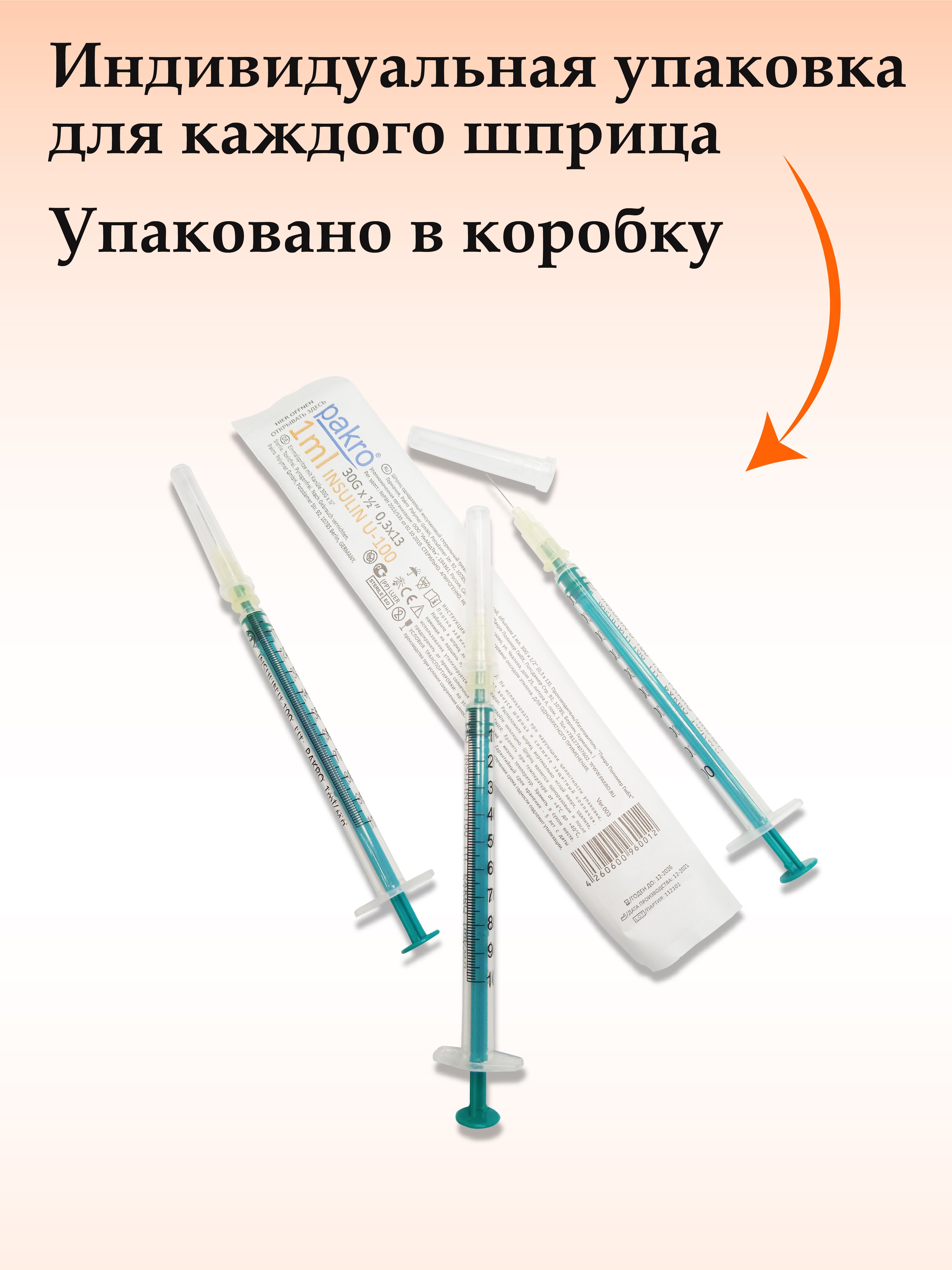 Шприц инсулиновый 1мл U-100 c иглой 30G 0,30 х 13 мм (50 шт.), Pakro