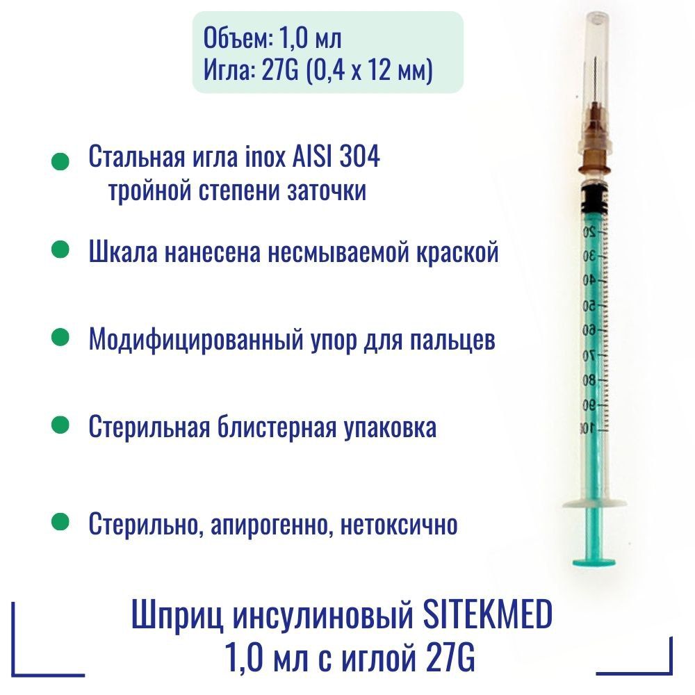 Шприц инсулиновый SITEKMED объемом 1,0 мл. с иглой 27G (0,4 х 12мм.) одноразовый/стерильный/трехкомпонентный - 10 шт.