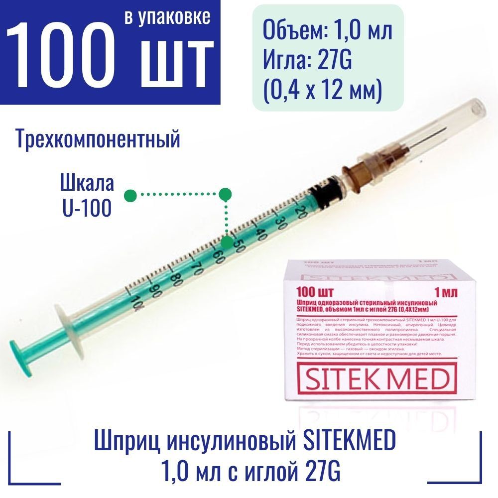 Шприц инсулиновый трехкомпонентный SITEKMED объемом 1,0 мл. с иглой 27G (0,4 х 12мм.) одноразовый/стерильный/уп. - 100 шт.