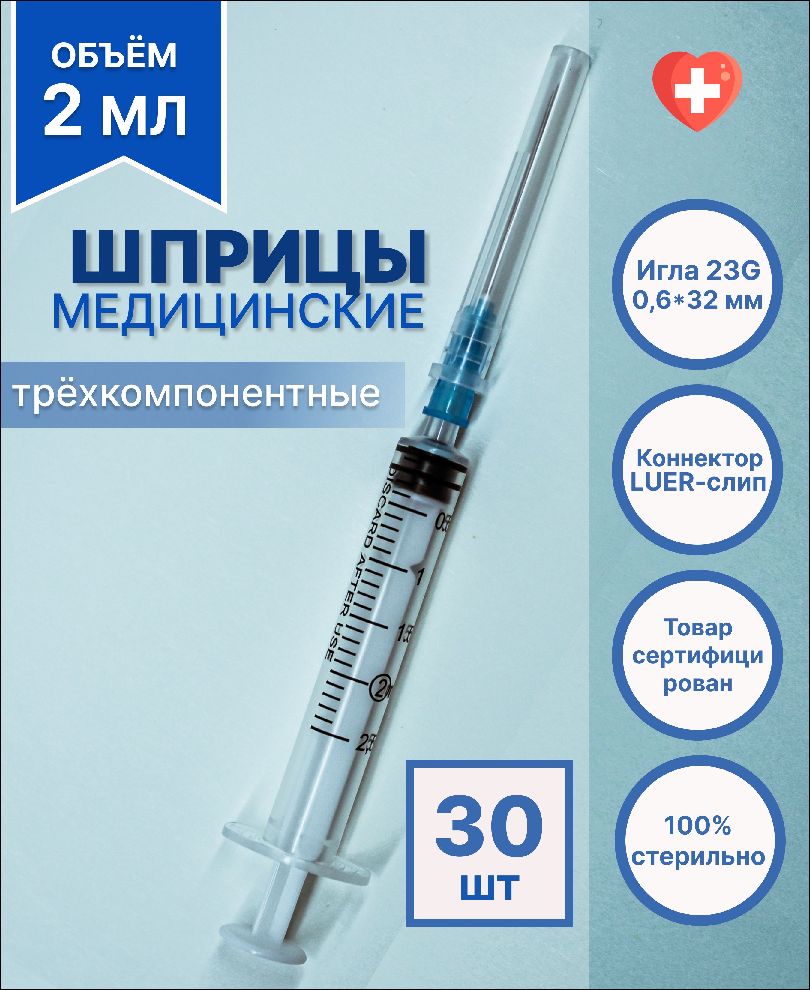 Шприц медицинский 2 мл одноразовый стерильный для инъекций с иглой LUER 23G, 0,6х32 мм, 30 штук