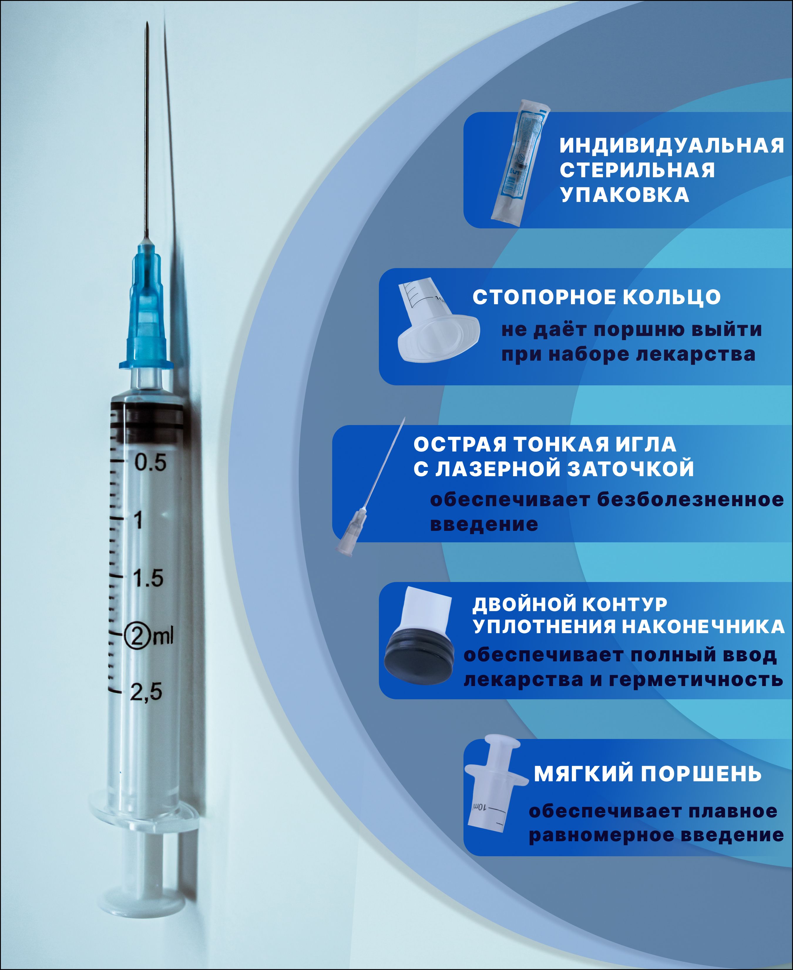Описание: Шприцы медицинские 2 мл одноразовые стерильные трехкомпонентные применяют для выполнения подкожных, внутримышечных инъекций и других лечебно-диагностических мероприятий, после использования утилизировать.