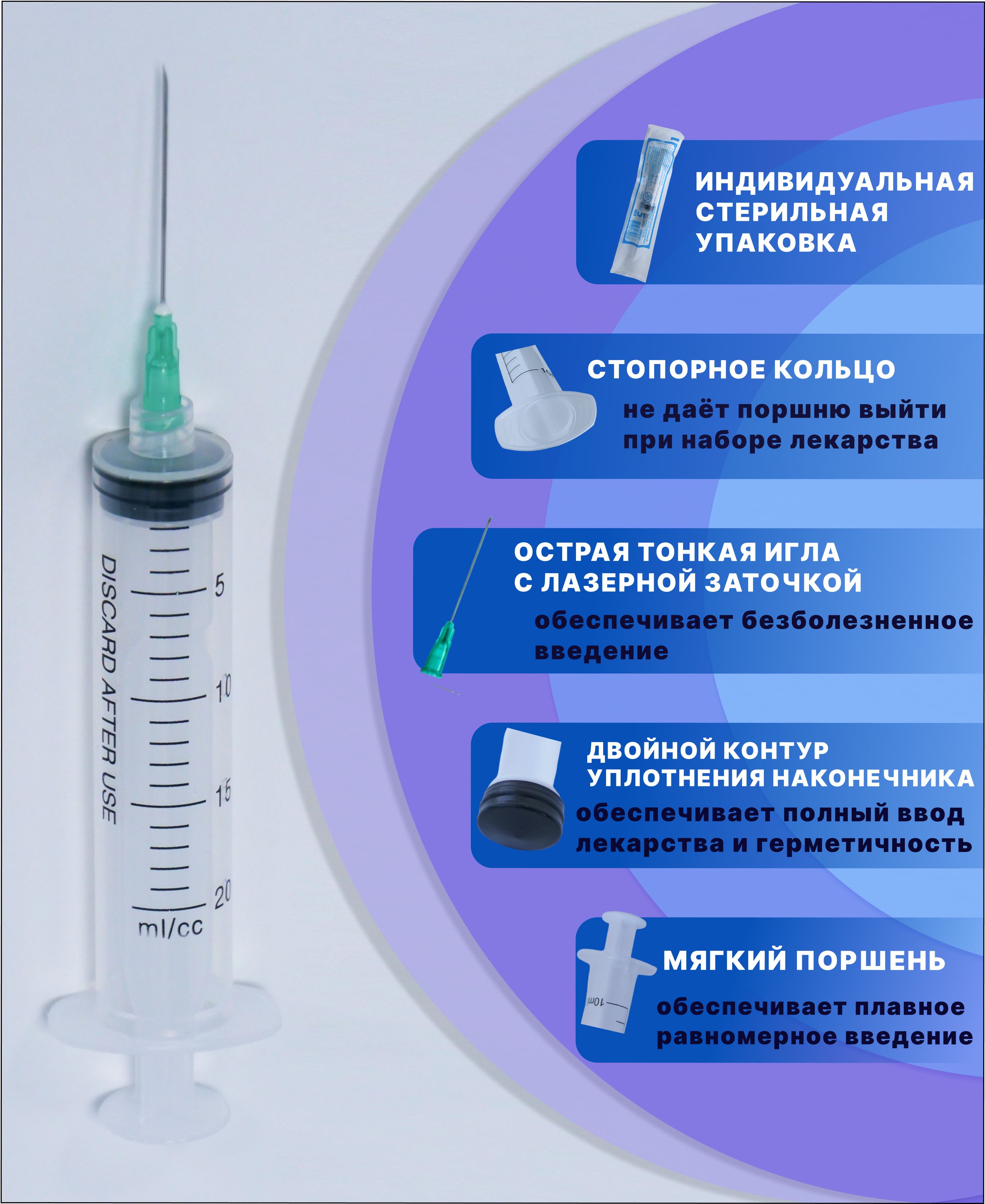 Описание: Шприцы медицинские 20 мл луер-лок одноразовые стерильные трехкомпонентные применяют для выполнения подкожных, внутримышечных инъекций и других лечебно-диагностических мероприятий, после использования утилизировать.