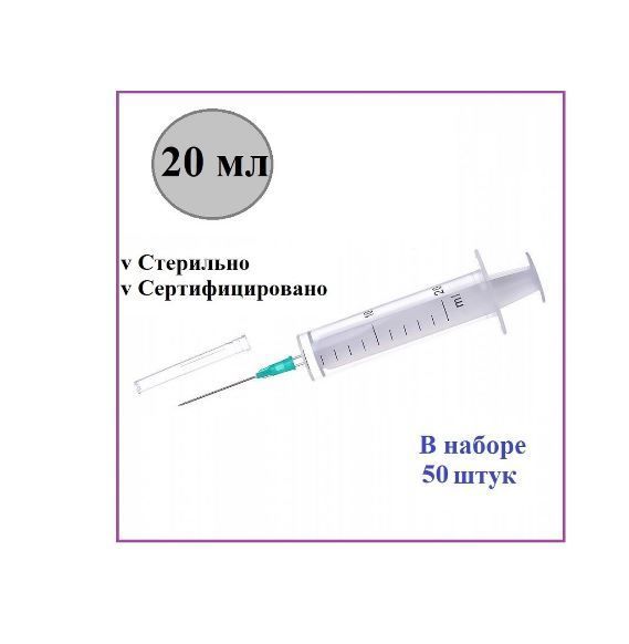Шприц медицинский 20 мл одноразовый стерильный для инъекций с иглой 50 шт