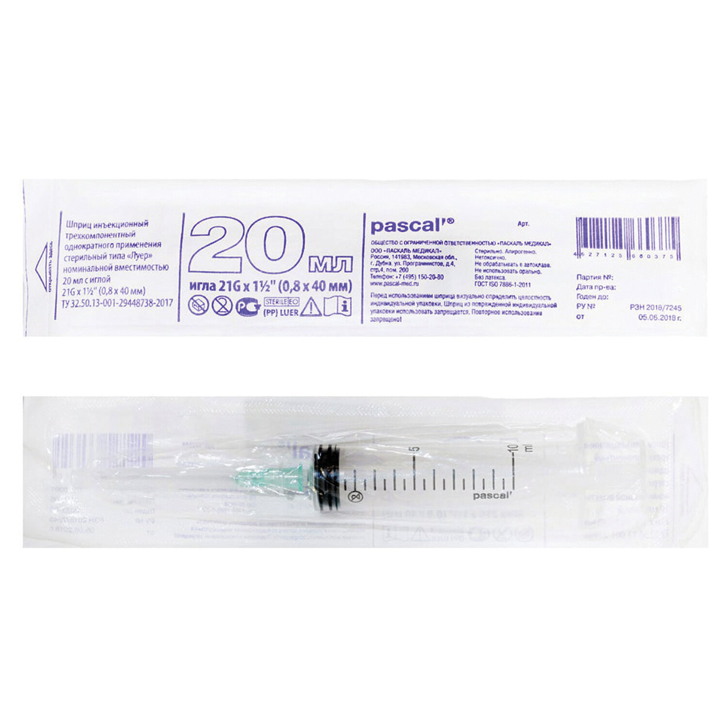 Шприц медицинский 3-х компонентный Pascal, 20 мл Комплект 5 шт. в коробке, игла 0,8х40 - 21G, ш/