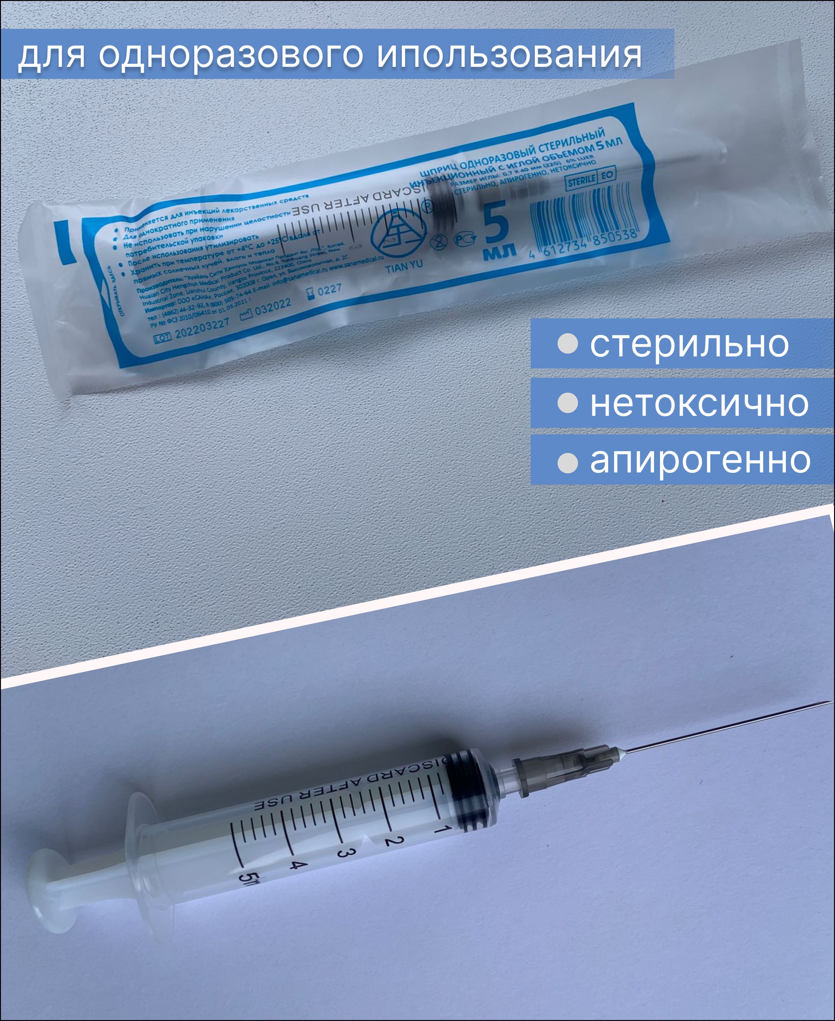 СТЕРИЛЬНО, АПИРОГЕННО, НЕТОКСИЧНО. Шприцы 5 мл одноразовые также используют в косметологии, для косметических целей и подкожных процедур, как шприцы для уколов и инъекций. Срок годности до 02.2027. После использования утилизировать.