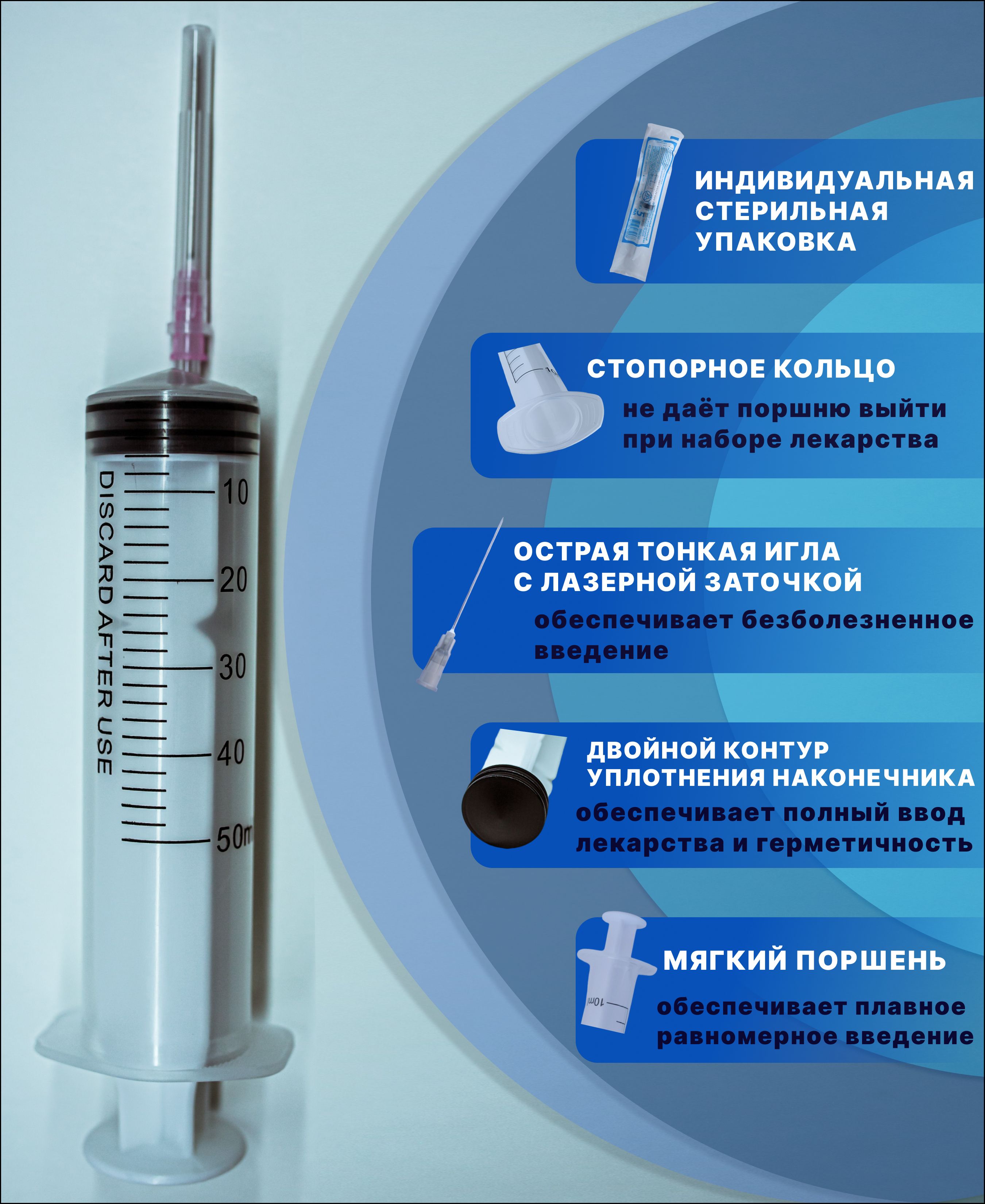 Описание: Шприцы медицинские 50 мл одноразовые стерильные трехкомпонентные применяют для выполнения подкожных, внутримышечных инъекций и других лечебно-диагностических мероприятий, после использования утилизировать.