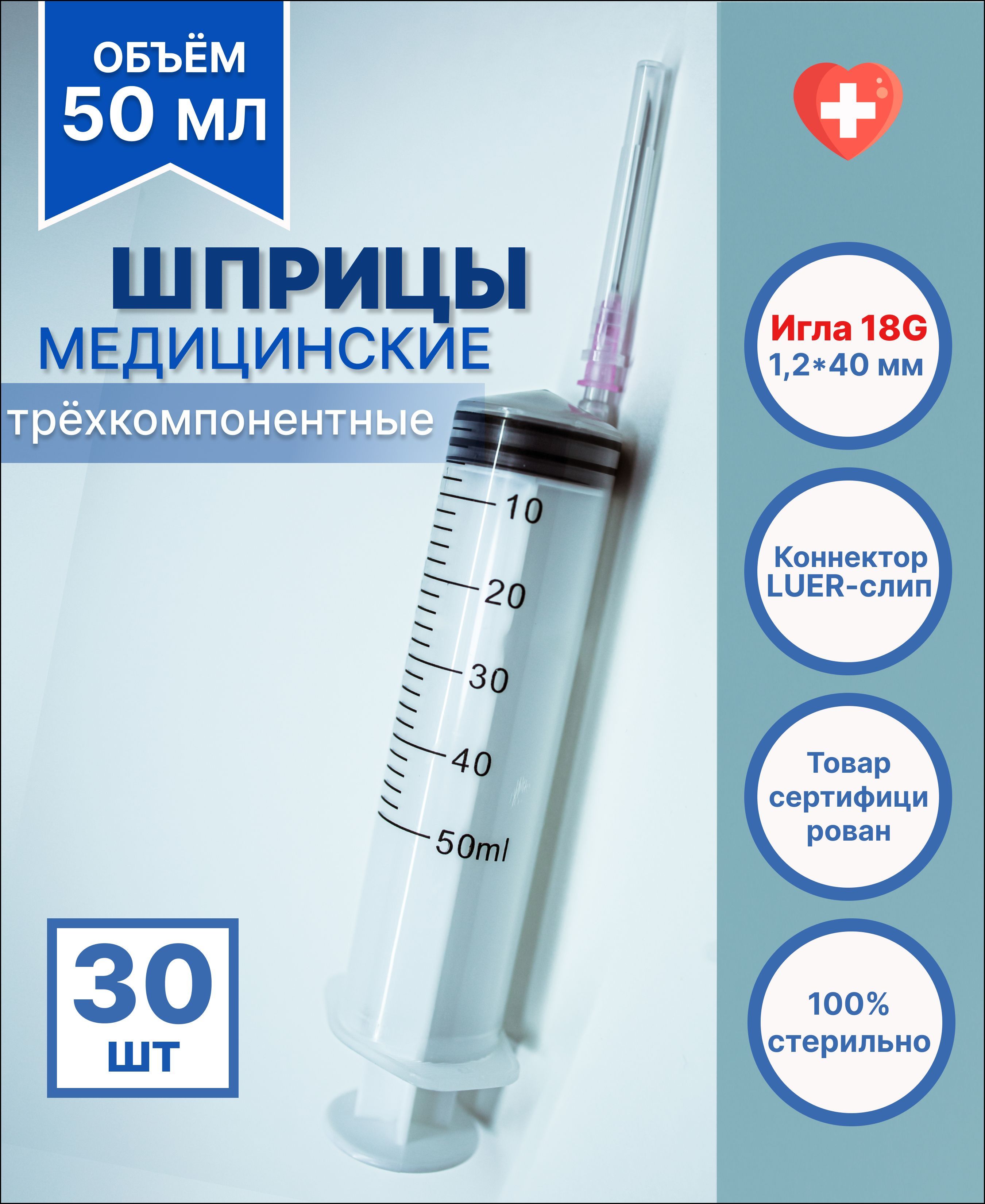 Шприц медицинский 50 мл одноразовый стерильный для инъекций с иглой LUER-слип 18G 1,2*40мм, 30 штук