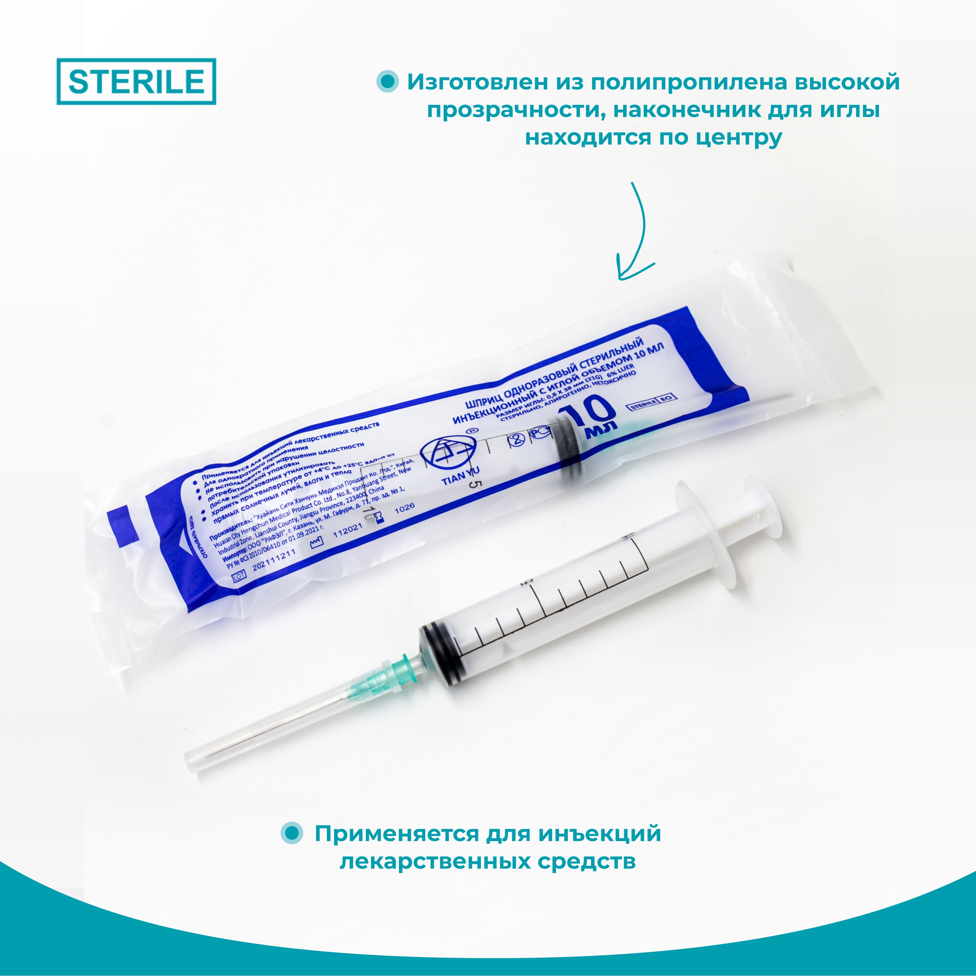 Шприц медицинский инъекционный 5 штук, 10мл. стерильный / с иглой