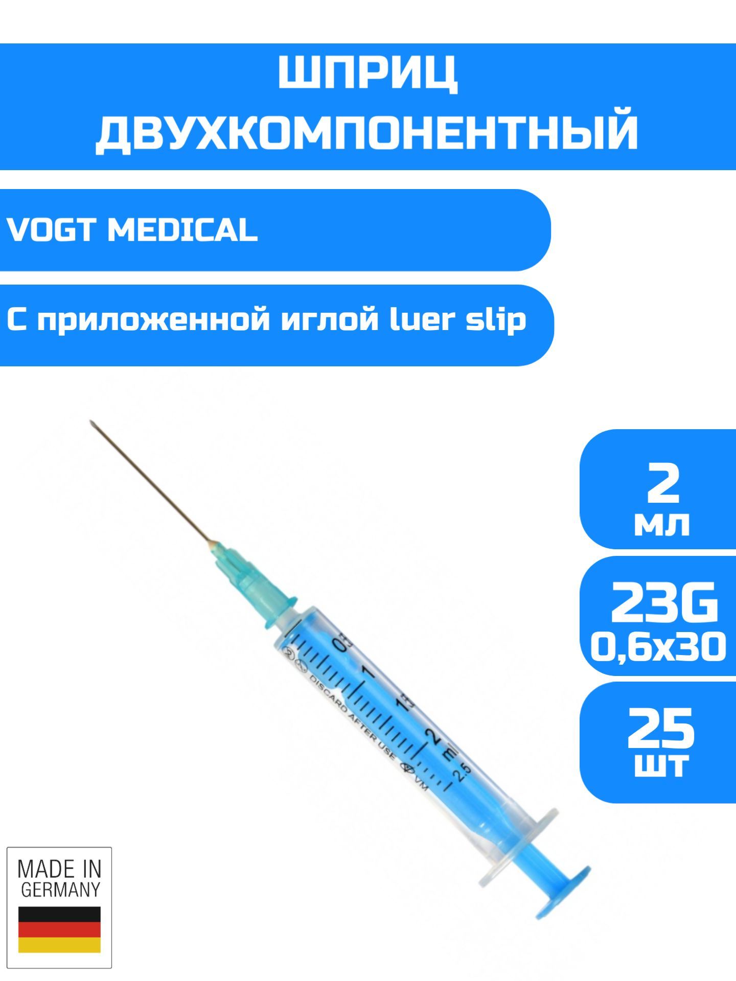 Шприц медицинский одноразовый стерильный 2-х комп. 2,0 (2,5) мл. с приложенной иглой 23G (0,6х30 мм.) ЛУЕР-ЛОК Vogt Medical, 25 шт