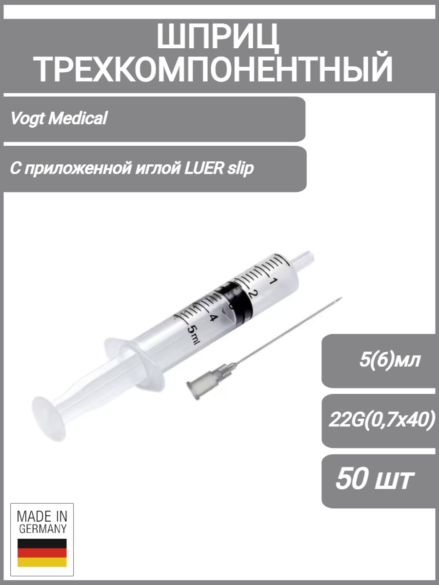 Шприц медицинский одноразовый стерильный 3-х комп. 5 (6) мл. с приложенной иглой 22G (0,7х40 мм.) Vogt Medical, 50 шт