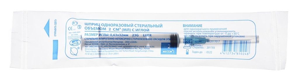 Шприц медицинский со съемной иглой, Sana Medical, стерильный одноразовый, игла 0,6х30мм 23G, 2 мл, 120 штук