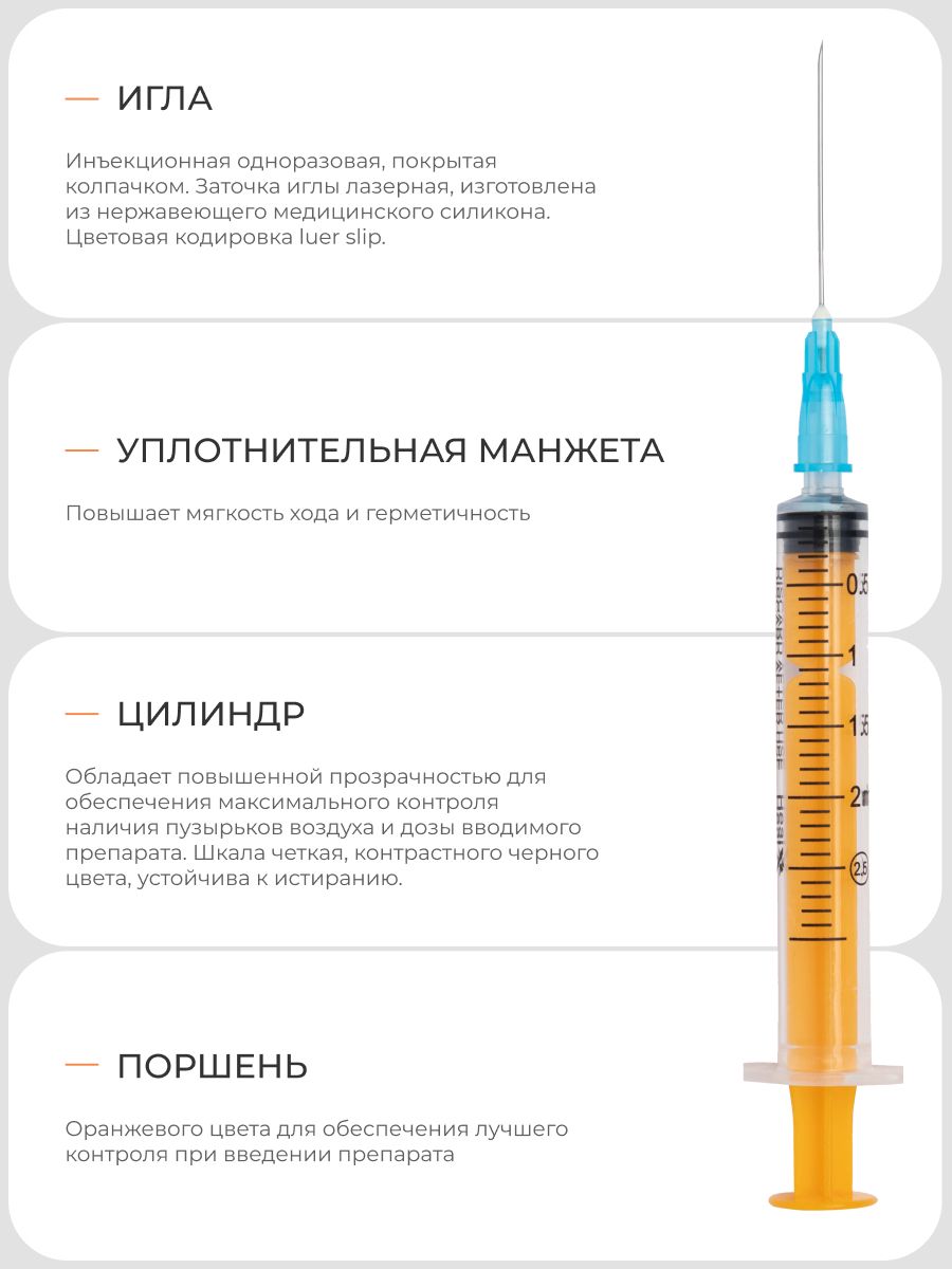 Тройная упаковка позволяет сохранить стерильность шприца в процессе транспортировки и хранения на протяжении всего срока годности.