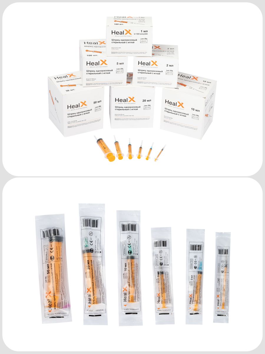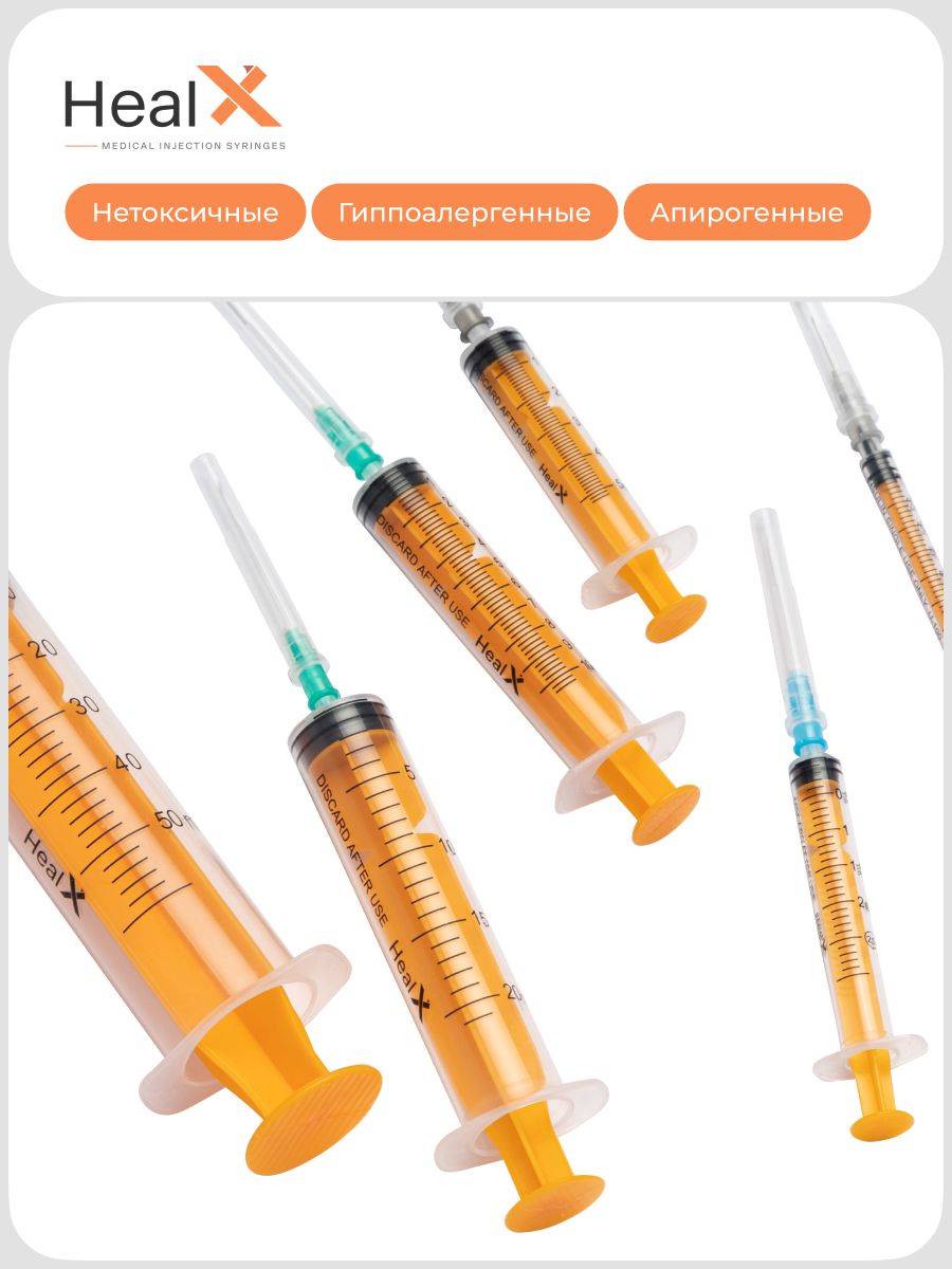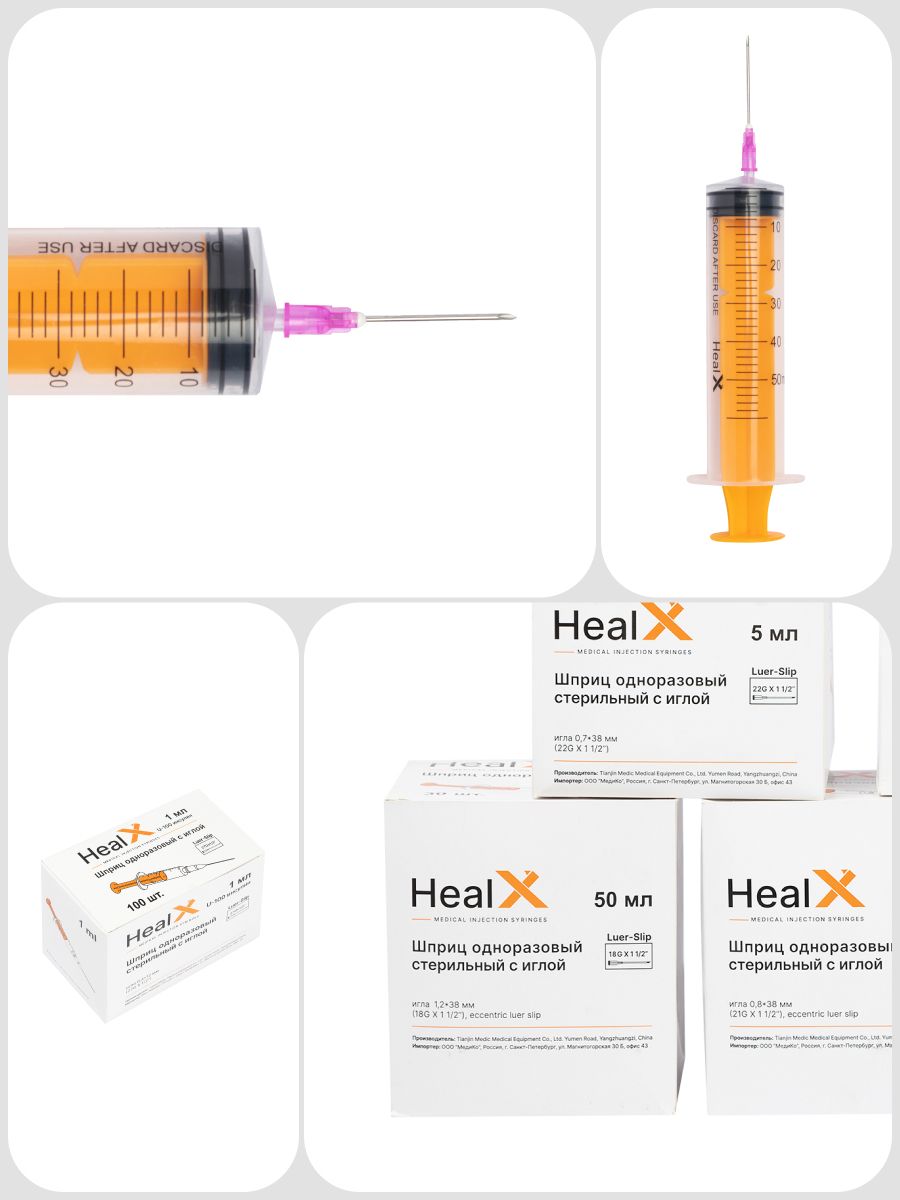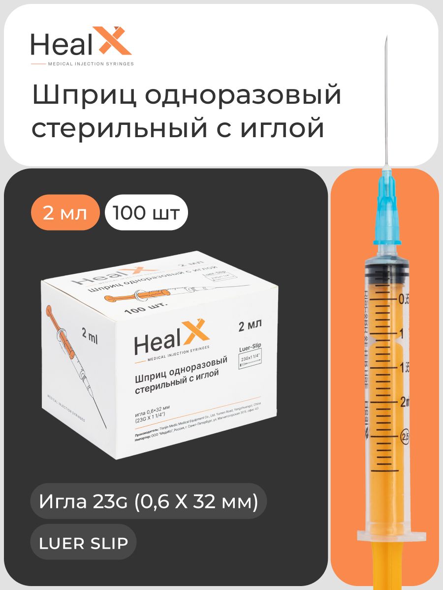 Шприц одноразовый стерильный с иглой, 2 мл (23G 0,6 Х 32 мм, luer slip) - 100 шт / трехкомпонентный для инъекций / HealX