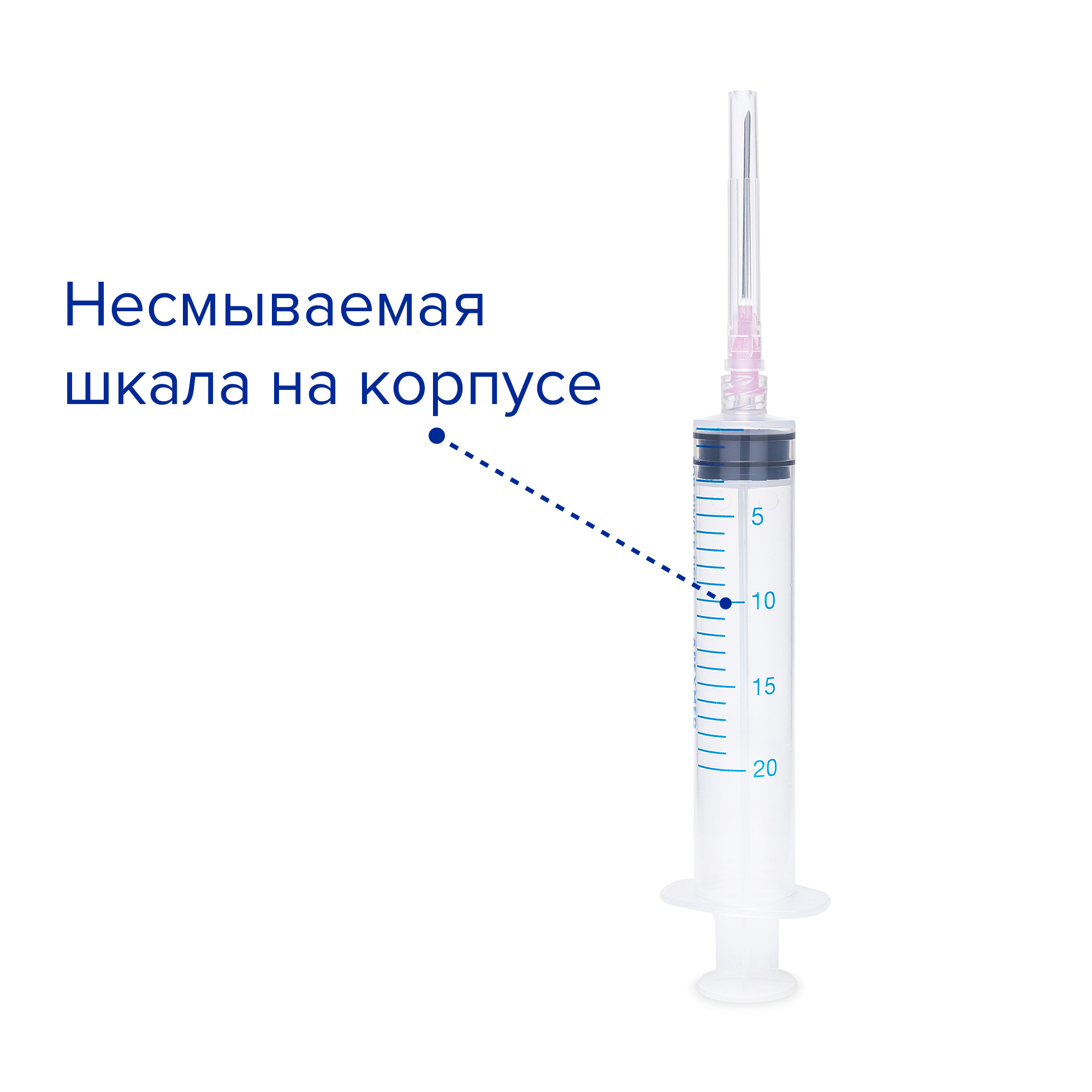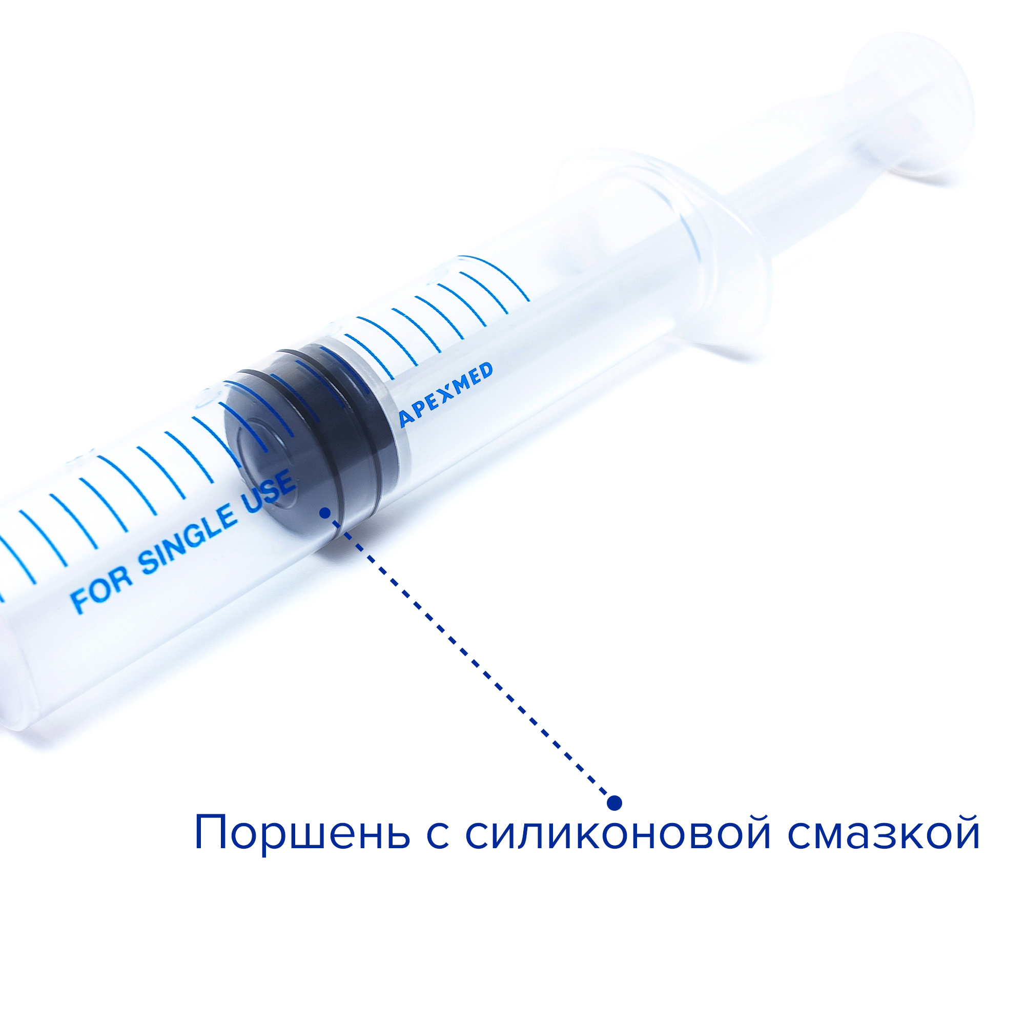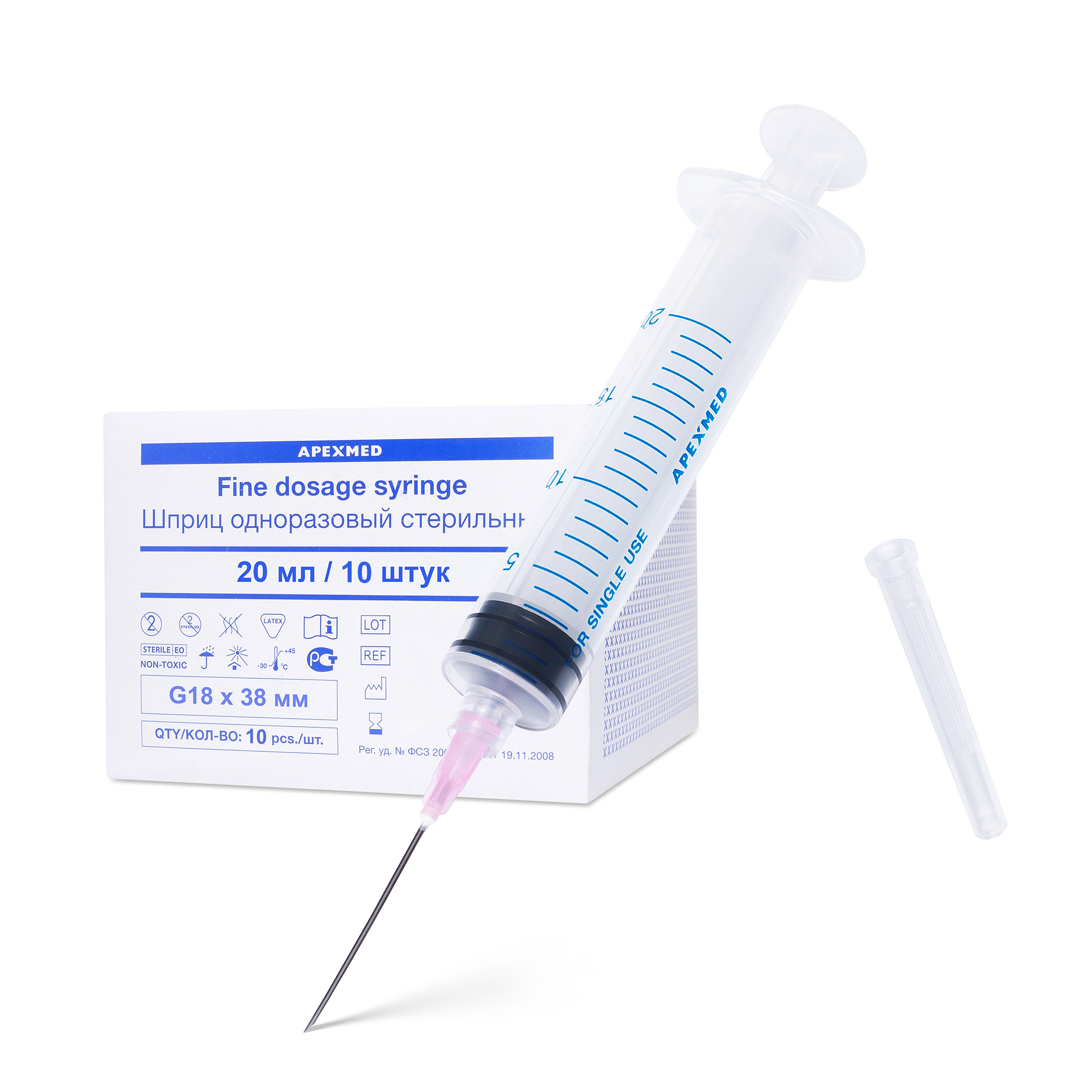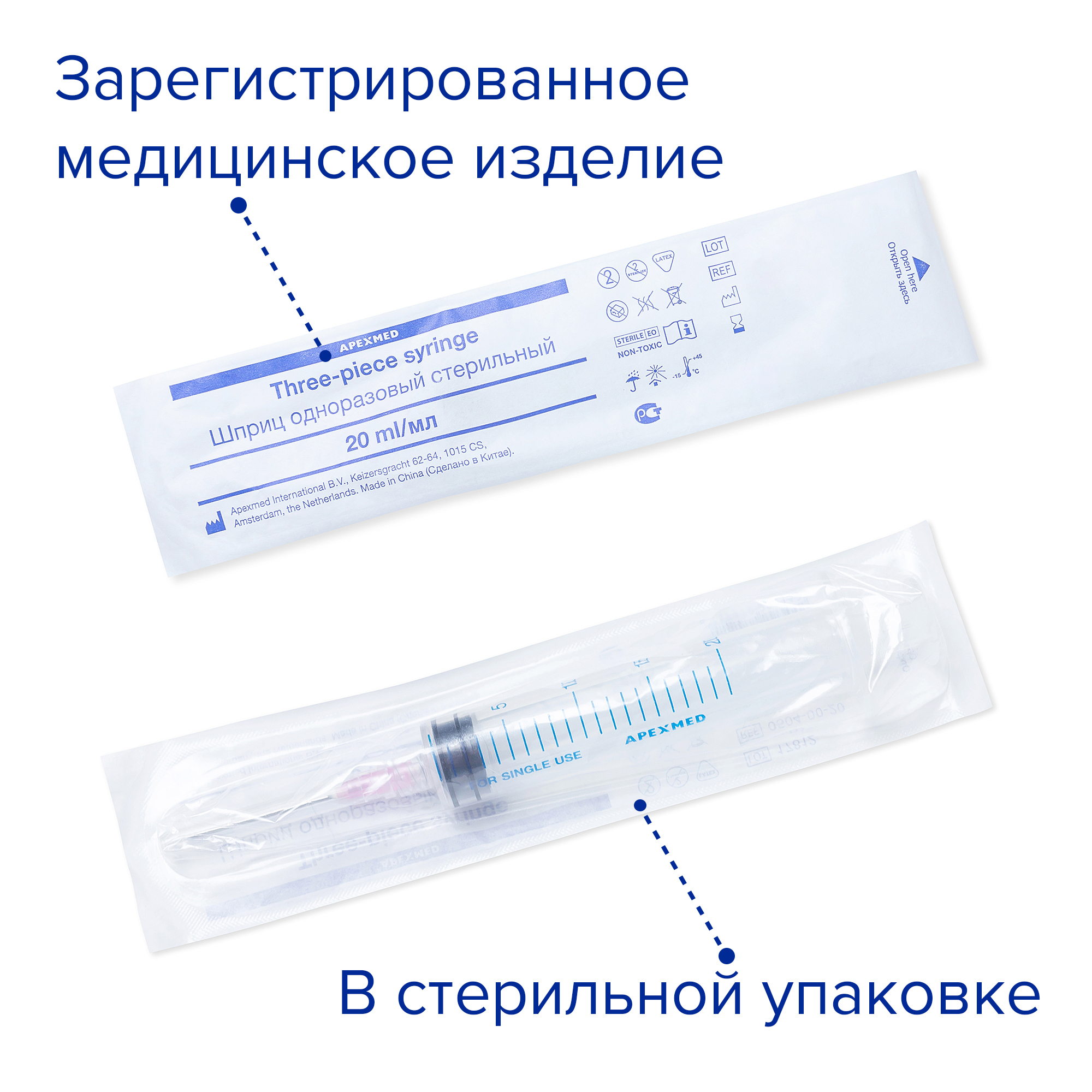 Шприц с иглой Apexmed Луер-лок, 20 мл, 10 шт, трехкомпонентный, инъекционный, для внутривенных и внутримышечных инъекций и уколов