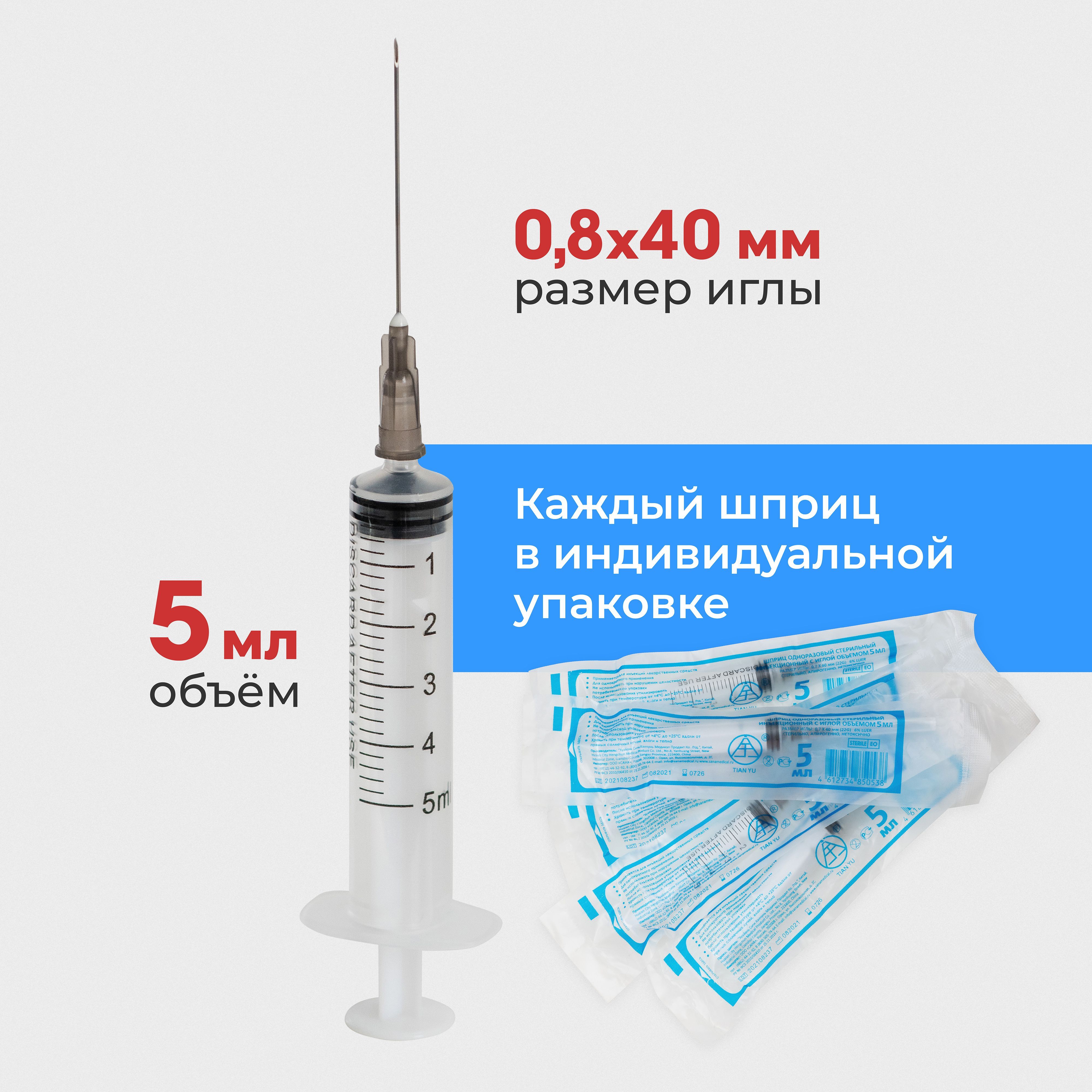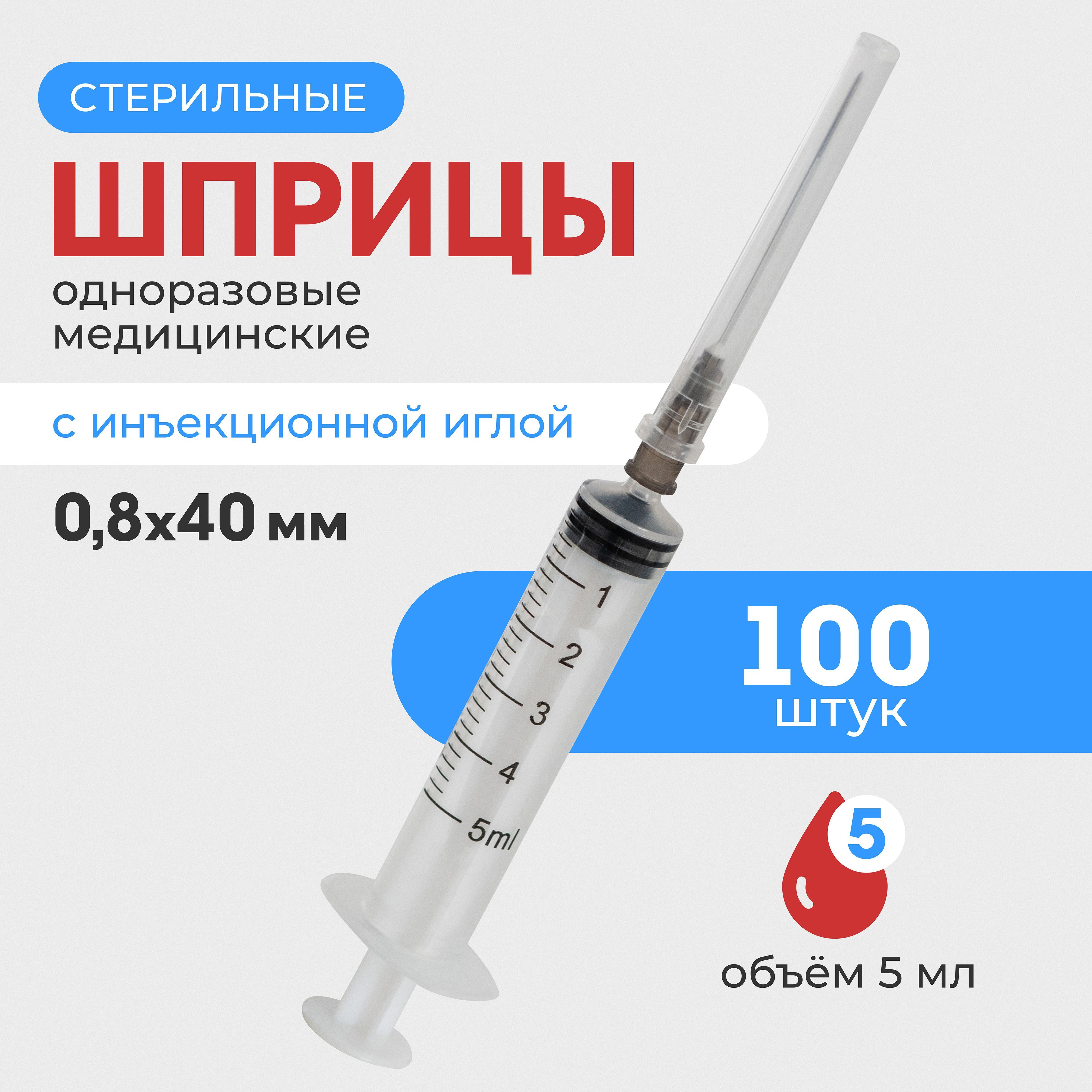 Описание: Набор одноразовых стерильных медицинских инъекционных шприцов с иглой. 100 штук. Каждый шприц в индивидуальной упаковке. Размер иглы 0,8 х 40 мм 21G*11/2. Иглы производятся из высококачественной нержавеющей аустенитной стали с трехгранной лазерной заточкой. Стерилизация: газовая, ЕО (этилен оксид). Тип наконечника: ЛУЕР-СЛИП (LUER-SLIP). Игла острая со скошенным краем. Движением поршня шприца легко управлять - оно плавное, без скачков и без препятствий. Основное назначение шприцов - внутримышечное, внутривенное, подкожное вливание лекарственных средств. Эти шприцы используются в косметологической сфере. Активно применяются в ветеринарных клиниках для уколов, забора крови и кормления животных. Объём 5 мл делает шприц универсальным инструментом в быту: с помощью него можно заправить картридж, смазать маслом старые заржавевшие петли или даже украсить кондитерские изделия. Материал, из которого изготовлены шприцы нетоксичен и не вызывает аллергию. Товар полностью сертифицирован, имеет регистрационное удостоверение и официально поставляется в государственные и частные медицинские учреждения.