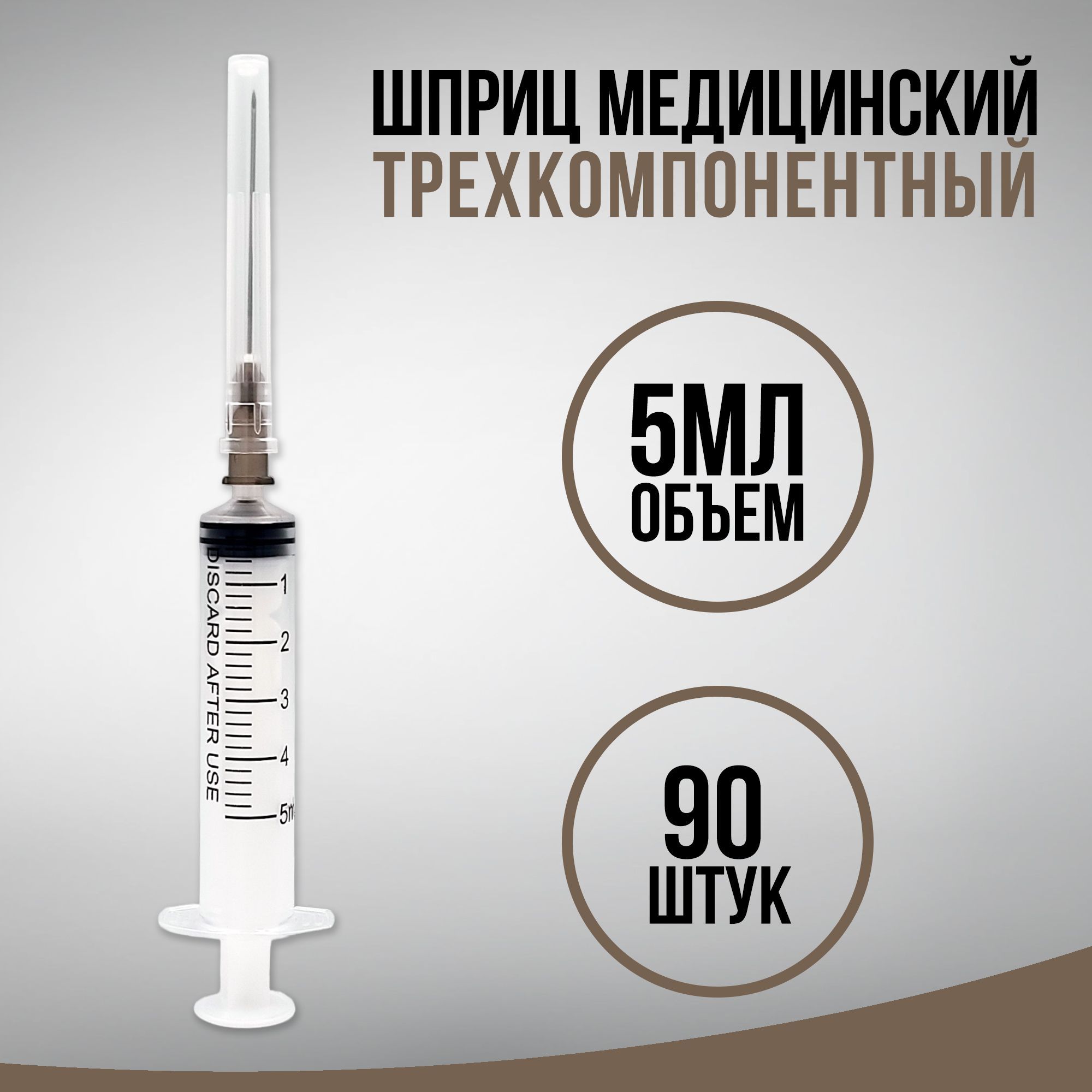 Шприц трехкомпонентный одноразовый медицинский инъекционный стерильный, для внутривенных и внутримышечных инъекций и уколов, с иглой 0,7 x 38 - 22G, 5 мл - 90 штук