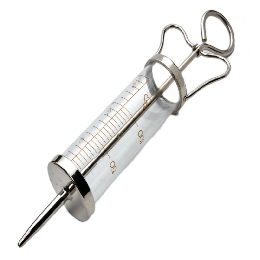 Также возможно использование для внутрибрюшинных и интратрахеальных вливаний. Шприц 150 мл многоразового использования - имеет стеклянный цилиндр с двойной шкалой-градуировкой на 150 мл, который совмещен с паяным соединением металлического носика.