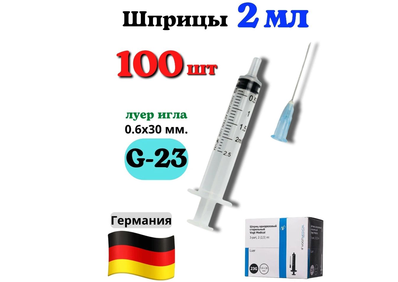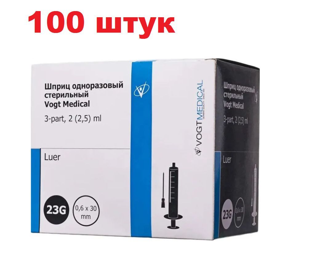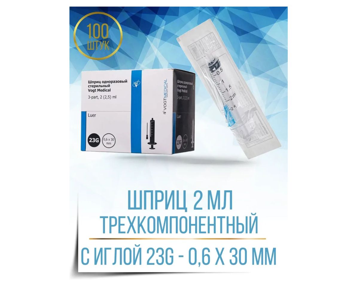 Шприцы для инъекций и уколов 2 мл, с иглой 0,6 x 30 - 23G, VOGT Medical, трехкомпонентные в упаковке 100 штук