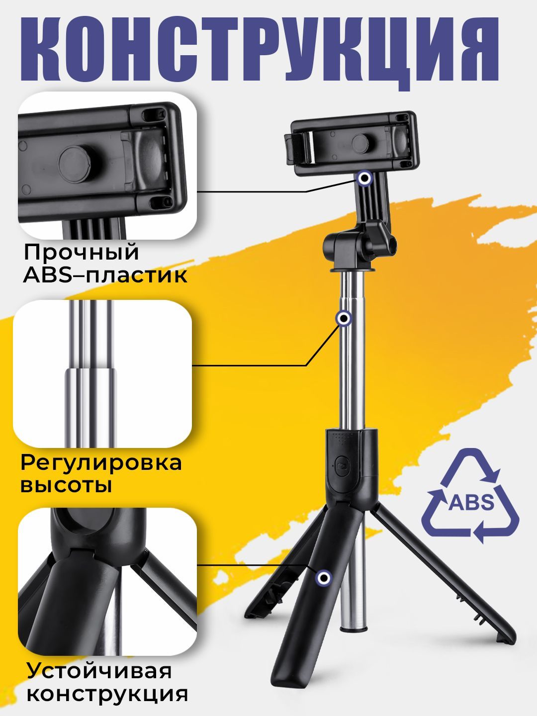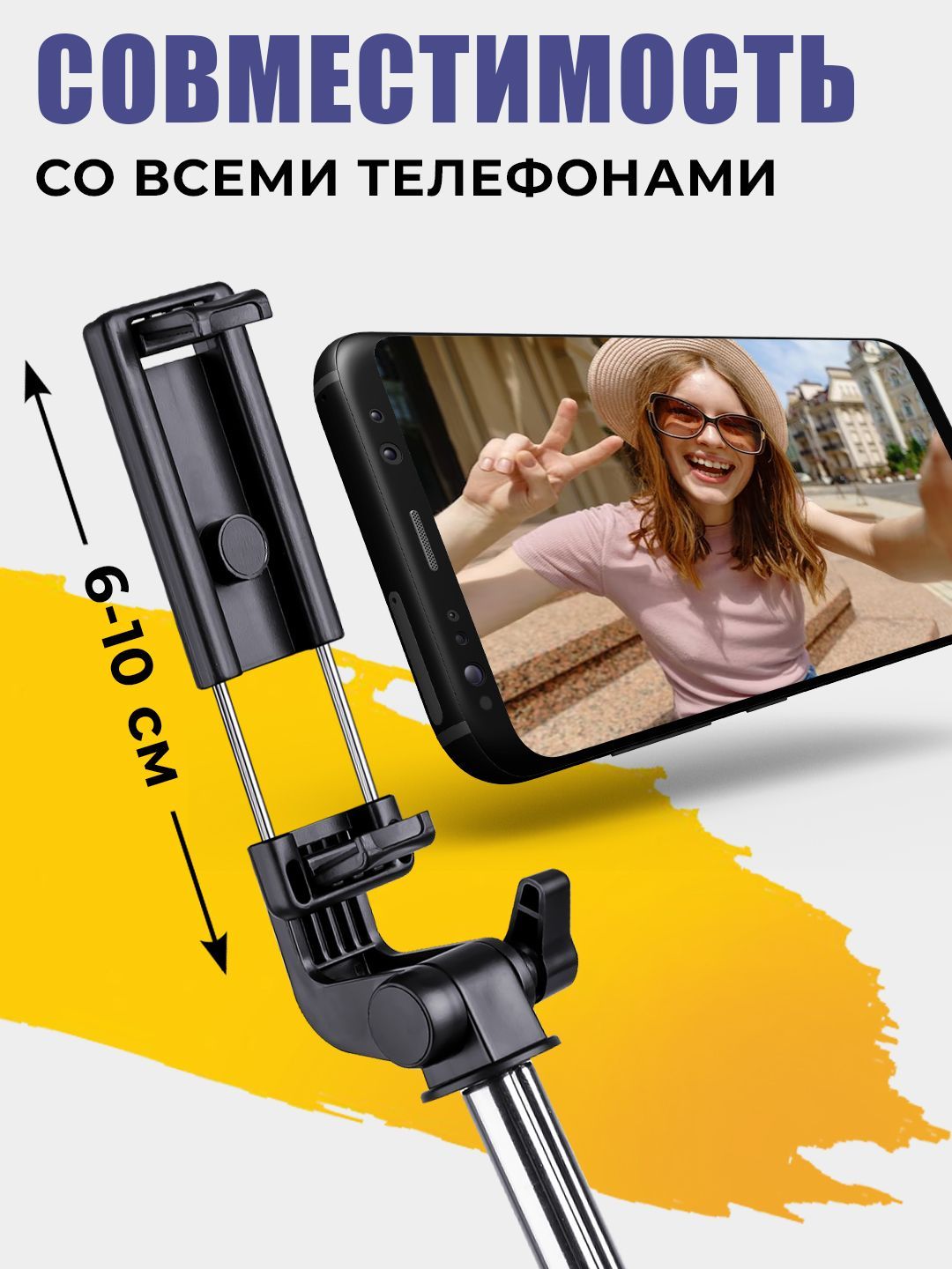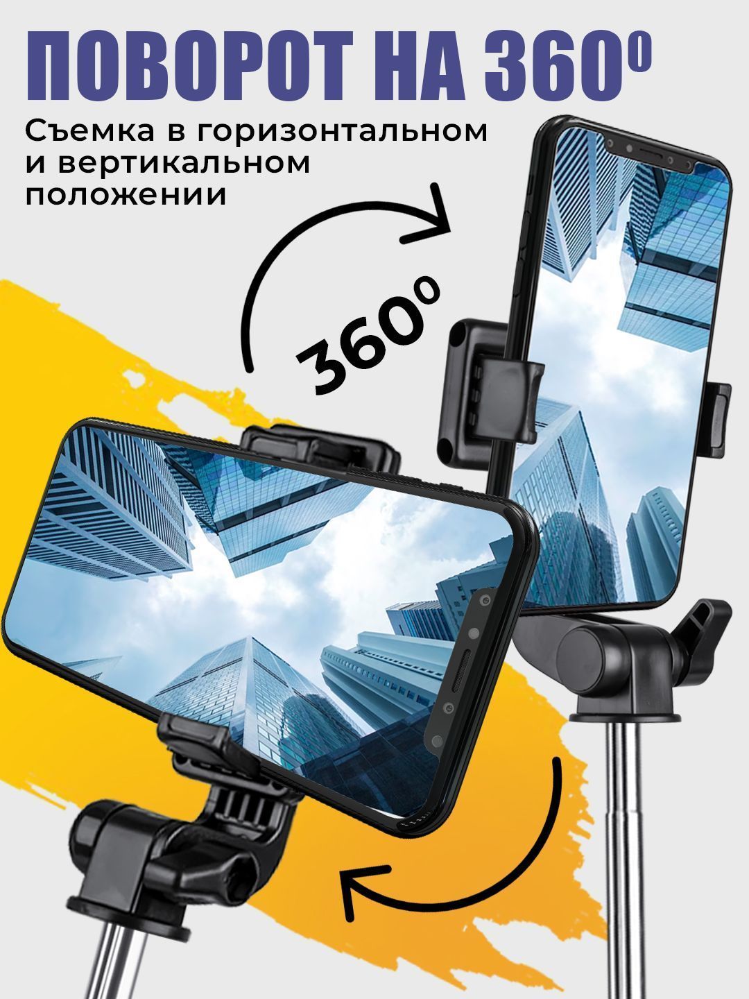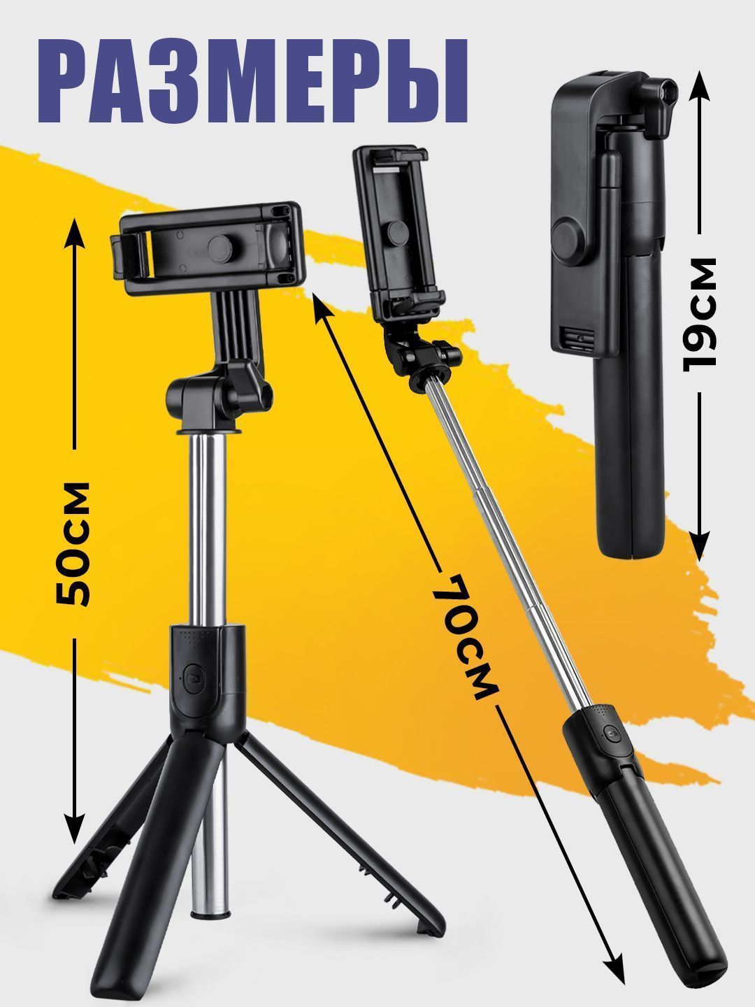 Описание: Штатив для телефонаНаш монопод - удобный и компактный аксессуар для любителей фотографировать или снимать видео. Штатив можно использовать для фотографирования в любых условияхУправлениеВ комплект селфи палки для смартфона входит Bluetooth-пульт, который позволяет удаленно управлять камерой вашего смартфона и делать фото и видео.КонструкцияМонопод для телефона позволяет