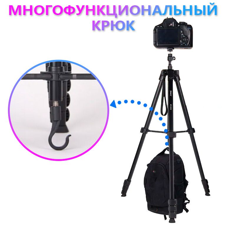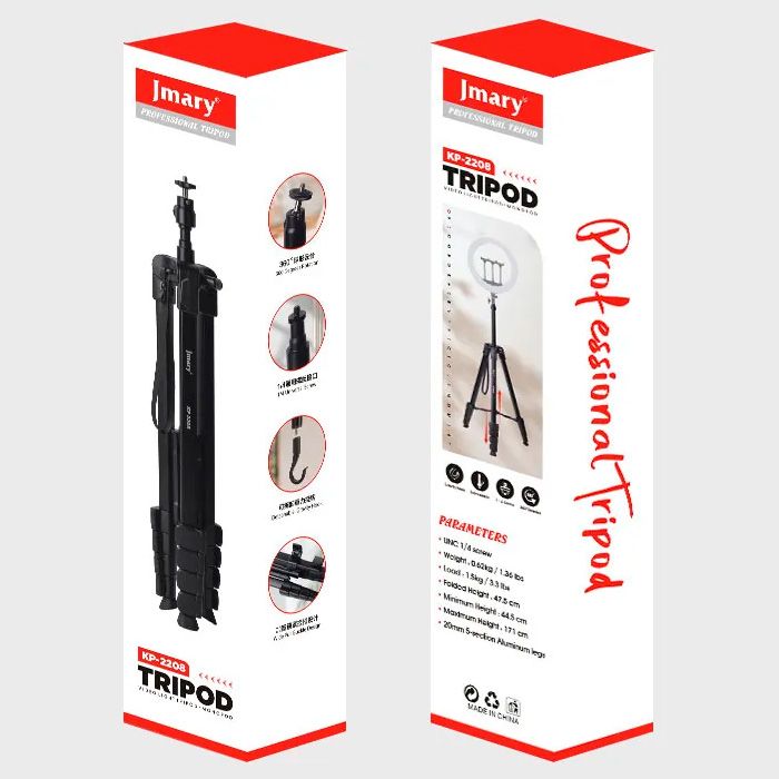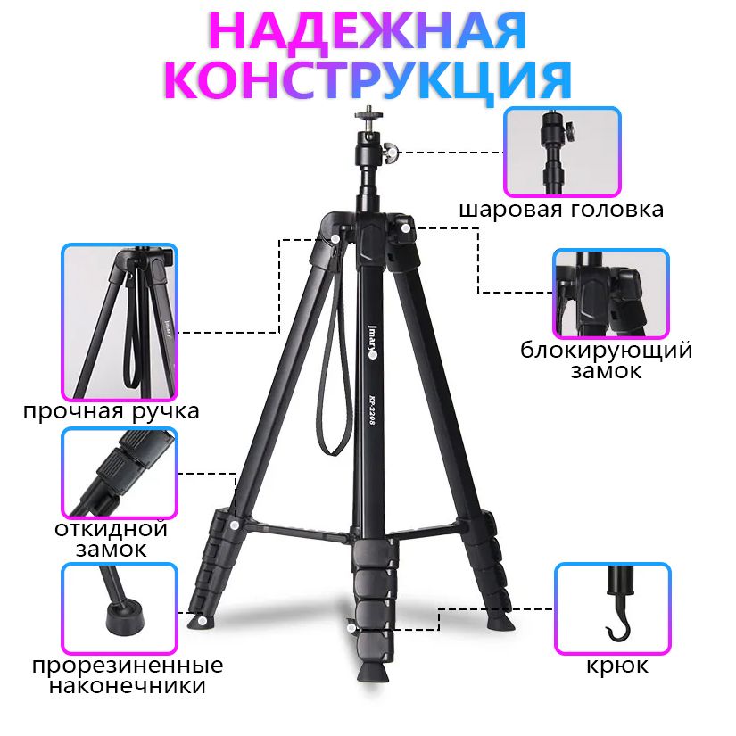 Описание: Устойчивый штатив Jmary KP-2208 с регулируемой высотой поможет вам сделать классные фотографии или снять качественный видео контент для своего блога. На нем можно зафиксировать фотоаппарат, видеокамеру, телефон или установить дополнительное освещение. Для этого сверху трипода установлена шаровая головка с универсальным винтовым креплением 1/4". Положение гаджетов можно отрегулировать, как вам удобно. Помимо раздвижных ножек, можно приподнять и центральную часть. Конструкция продумана до мельчайших деталей: выдвижные секции быстро и надежно раздвигаются, фиксируются между собой. В нижней части предусмотрен крюк для сумки или груза. В комплект входят: раздвижное крепление для смартфона, а также практичный чехол для удобства хранения и переноски штатива. Преимущества напольного штатива Jmary KP-2208 - ЧерныйПрочный и легкийКаркас Jmary KP-2208 изготовлен из износостойкого материала: алюминиевого сплава – это позволило снизить его вес до 620 г. На него можно устанавливать гаджеты весом до 1.2 кг. Высота регулируетсяБлагодаря телескопической конструкции высоту штатива можно изменять от 45 до 171 см – сможете выбрать оптимальное положение для съемки. Всего 5 выдвижных секции. В сложенном виде занимает немного места – 47.5 см в длину. Его удобно носить с собой. Многофункциональный крюкЧуть ниже платформы расположен крюк, на который для придания устойчивости в ветреную погоду можно подвесить дополнительный груз или повесить рюкзак, чтобы он не мешался под рукой и был на виду. Вращающаяся головкаГоловная часть стойки крепко держит гаджеты и вращается на 360 градусов в горизонтальной плоскости, откидывается на 90 градусов по вертикали, а также позволяет изменять положение объектива камеры по вертикали. Ее положение можно плавно регулировать и фиксировать. Устойчивая конструкцияJmary KP-2208 опирается на треногу. Ножки раздвигаются и фиксируются в одном положении. На конце каждой имеется прорезиненный наконечник, поэтому стойка устойчиво стоит на любой поверхности, а не скользит. УниверсальныйСверху штатива находится стандартный винт 1/4" – крепление для студийной фототехники, гаджетов и держателей. На него можно закрепить раздвижной зажим для телефона из комплекта, или фотоаппарат, кольцевую лампу, видеокамеру с таким разъемом. Технические характеристики напольного штатива Jmary KP-2208 - Черный