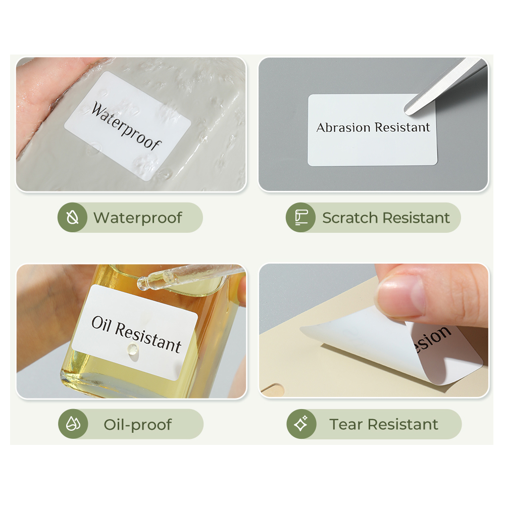 Этикетки NIIMBOT водонепроницаемы, протираются, самоклеятся, устойчивы к разрыву, не содержат бисфенола А, устойчивы к пыли и царапинам и служат дольше, чем обычные этикетки.