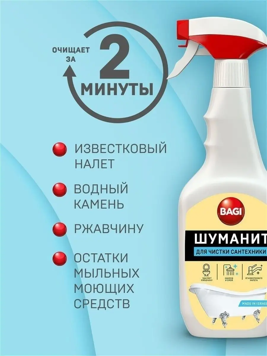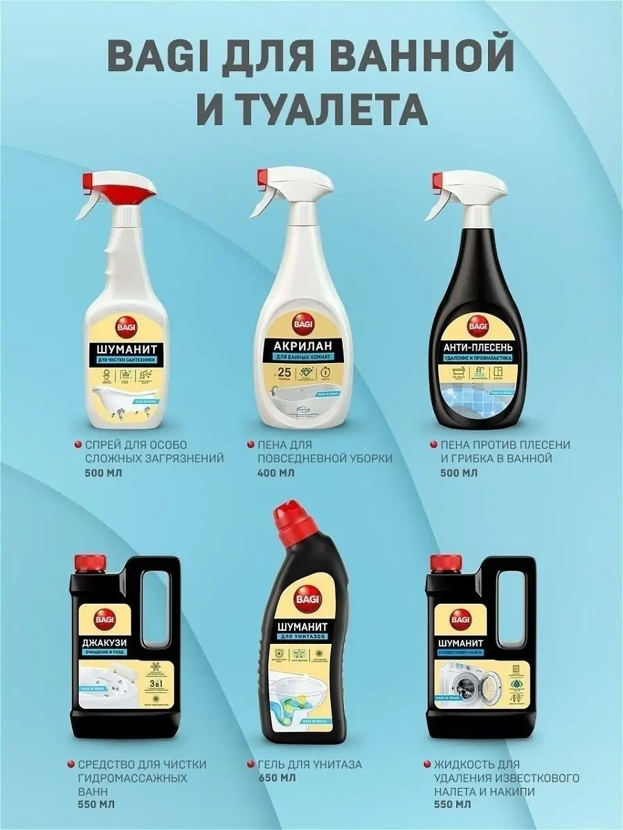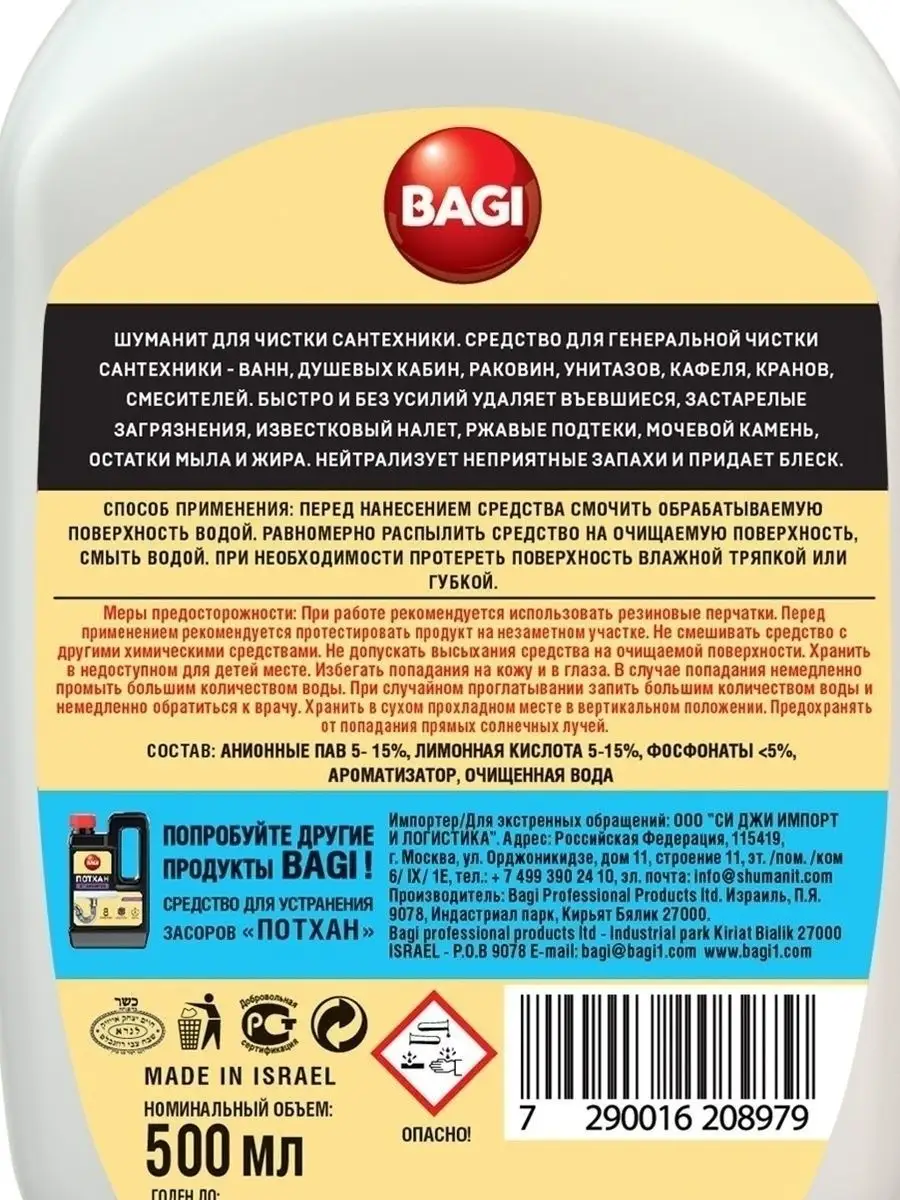 Описание: Бытовая химия для ванной – Шуманит для чистки сантехники. Это концентрированное чистящее средство для ванной и туалета; душевых кабин; раковин; унитазов; кафеля; кранов; смесителей. Средство для мытья сантехники быстро и без усилий удаляет въевшиеся и застарелые загрязнения: известковый налет; ржавые подтеки; мочевой камень; остатки мыла и жира. Одним флаконом можно удалить загрязнения на разных поверхностях: эмалированная, акриловая, чугунная ванная; стеклянные или пластиковые двери душевой кабины; краны и душевые стойки (хромированный металл, нержавеющая сталь); керамическая плитка (напольная и настенная); фарфор, фаянс. Универсальное чистящее средство для ежедневной уборки очень экономично в применении - содержит высокую концентрацию активных веществ. Не требуется применение усилий: намочите поверхность, нанесите средство и равномерно распределите, подождите 1-2 минуты и смойте водой. Соблюдайте меры предосторожности и не давайте средству высыхать на поверхности. Для чистки искусственного и натурального камня рекомендуем использовать Шуманит для чистки интерьерного камня. Остерегайтесь подделок! Выбирая проверенного поставщика, вы приобретаете 100% оригинальный товар. ООО Си Джи Импорт и Логистика является официальным импортером Bagi в Россию и Белоруссию. Все товары магазина оригинальны.