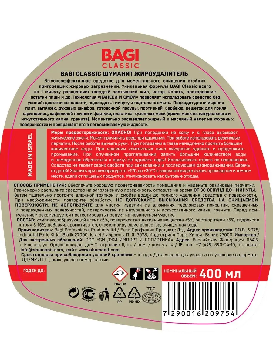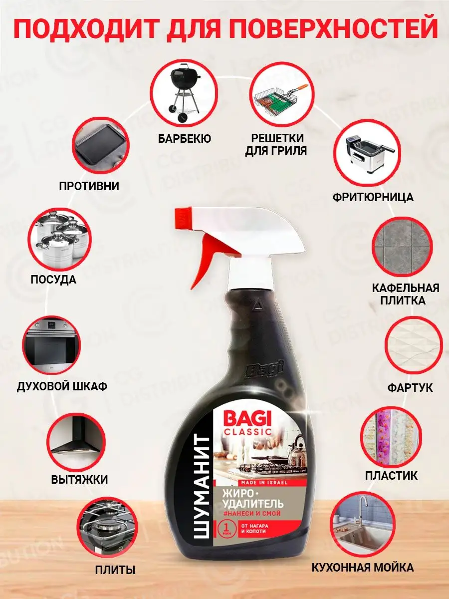 Описание: Новая линейка BAGI средства по уходу за домом BAGI CLASSIC. Запатентованные формулы и проверенный временем состав по приемлемой цене! Bagi Classic Шуманит жироудалитель высокоэффективное средство для быстрого очищения стойких пригоревших жировых загрязнений на кухне. Всего за 1 минуту активные компоненты чистящего средства для удаления жира на кухне расщепляют твердый застывший жир, нагар, копоть и пригоревшие остатки пищи. Антижир подходит для очищения плит, вытяжек, духовых шкафов, готовочной посуды, сковородок, противней, барбекю, решеток для гриля, фритюрниц, кафельной плитки, фартука, пластика, кухонных моек (кроме натурального и искусственного камня и гранита) и других поверхностей. Средство для уборки не рекомендуется использовать для чистки изделий из алюминия, окрашенных поверхностей и тефлоновых покрытий.