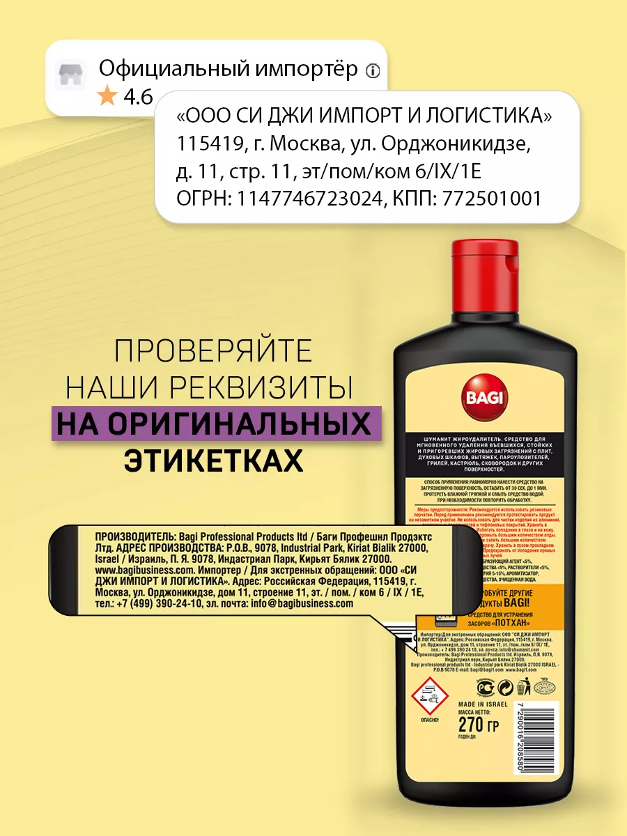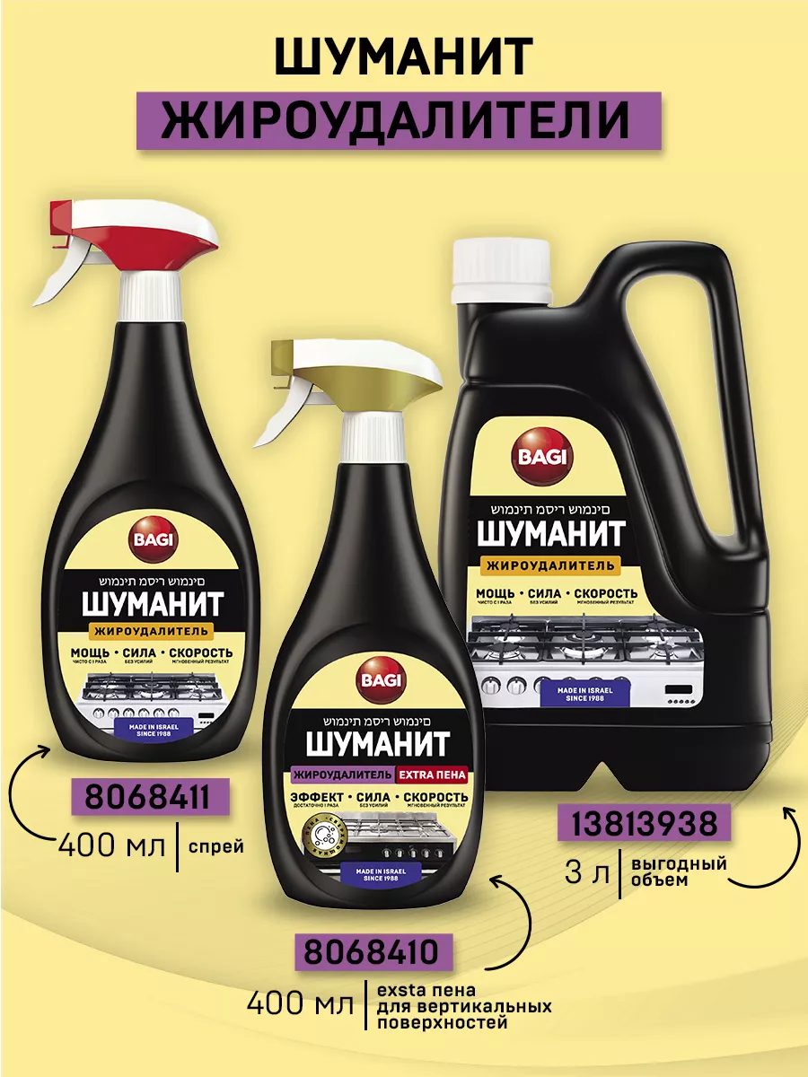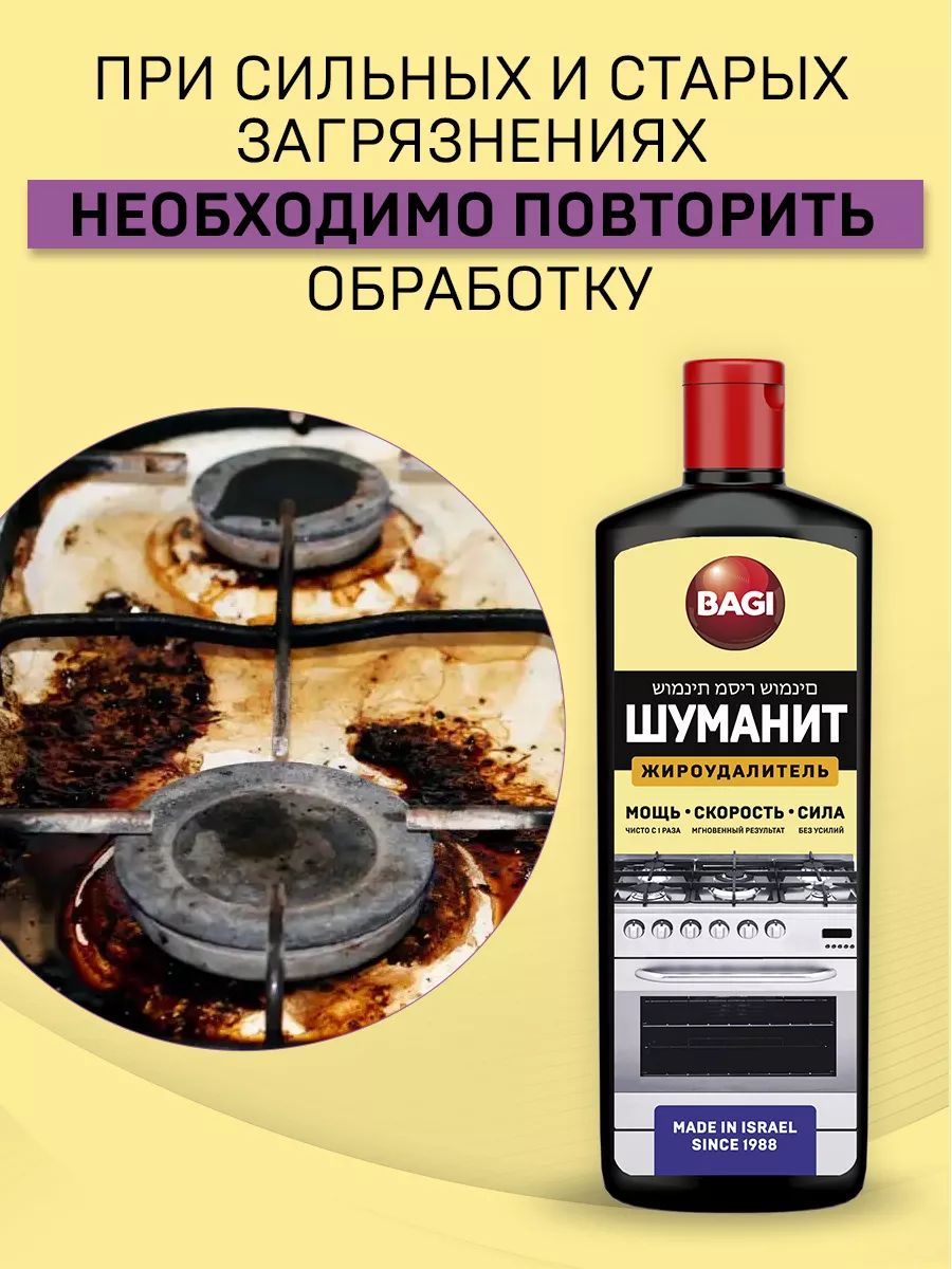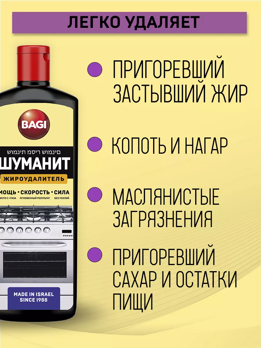 Описание: Чистящие средства Bagi для уборки дома, на кухне напрямую от производителя - Шуманит жироудалитель это мощное чистящее средство для чистки плиты; сковородок; духовки; кастрюль; гриля; казана от пригоревшего жира, нагара и копоти. Активные компоненты средства растворяют жир, нагар, пригоревшую пищу и стеклянных поверхностях (крышки, емкости для выпечки, форм для запекания, противень). Подходит для духовок, плит, варочных панелей, сковородок, сотейников, вытяжки, шампуров. НЕ ИСПОЛЬЗОВАТЬ для чистки изделий из алюминия, окрашенных поверхностей и тефлоновых и антипригарных покрытий. Антижир равномерно распределите по загрязненной поверхности и оставьте от 30 секунд до 1 минуты. Протрите и смойте водой. Средство для удаления жира использовать в резиновых перчатках в хорошо проветриваемом помещении.